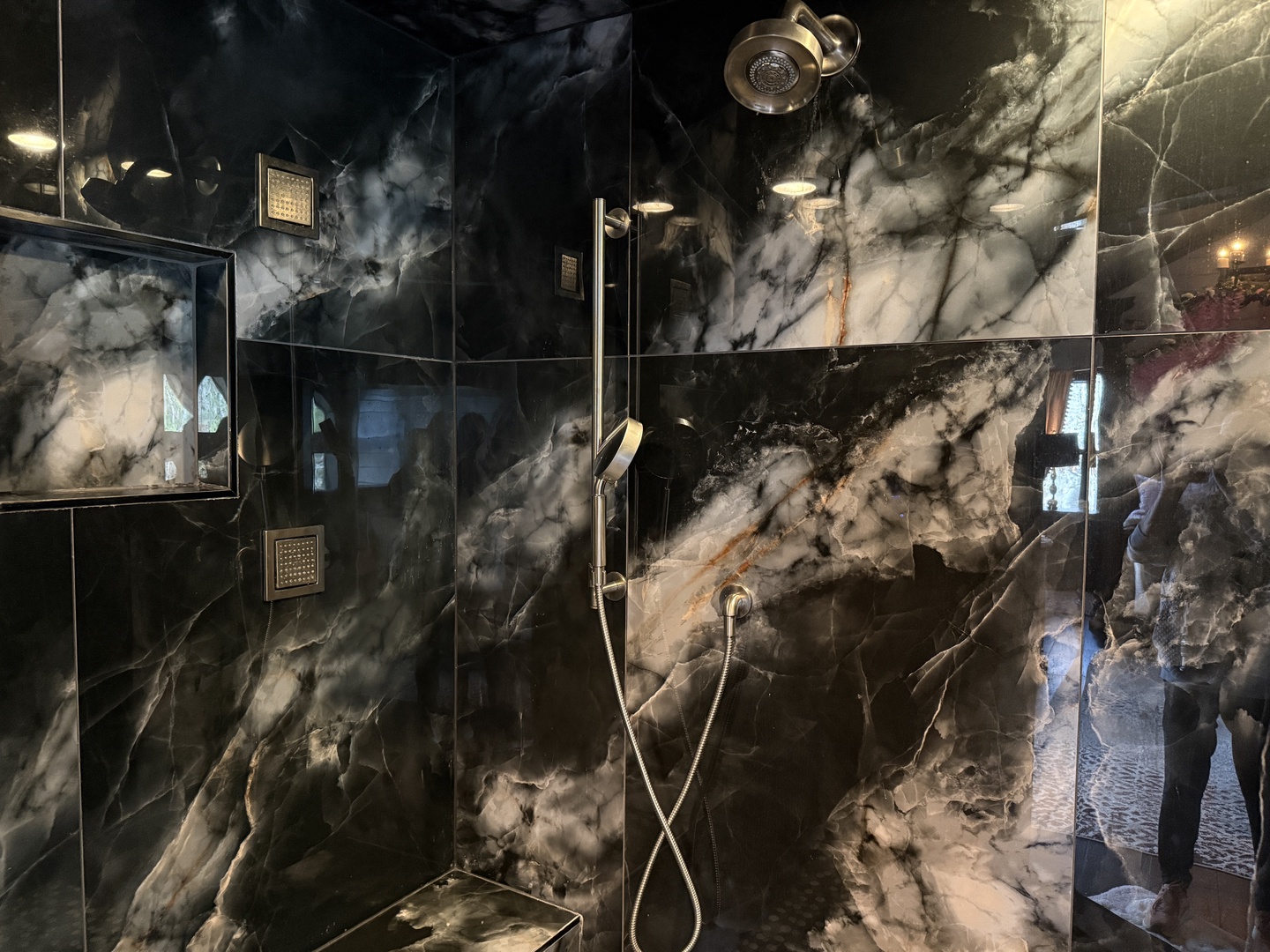 Dramatic black marbled tile for a bold Emerald City aesthetic