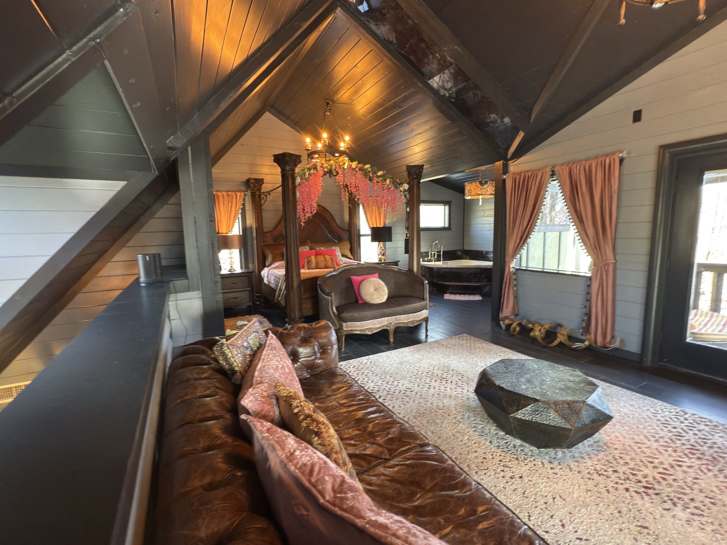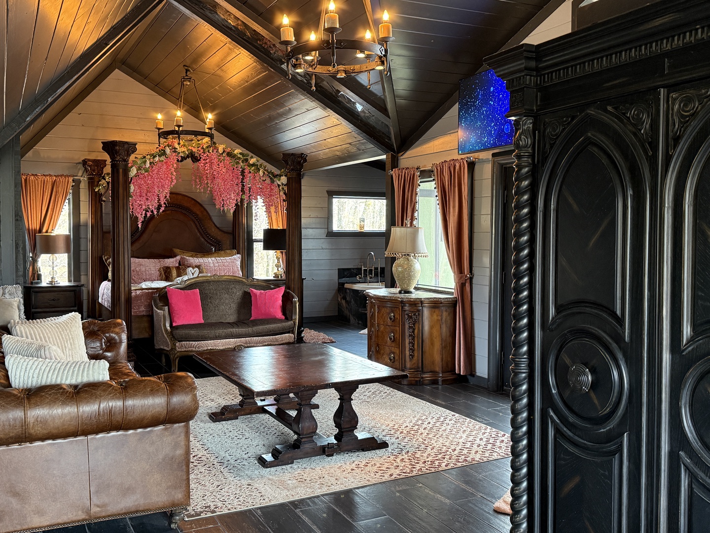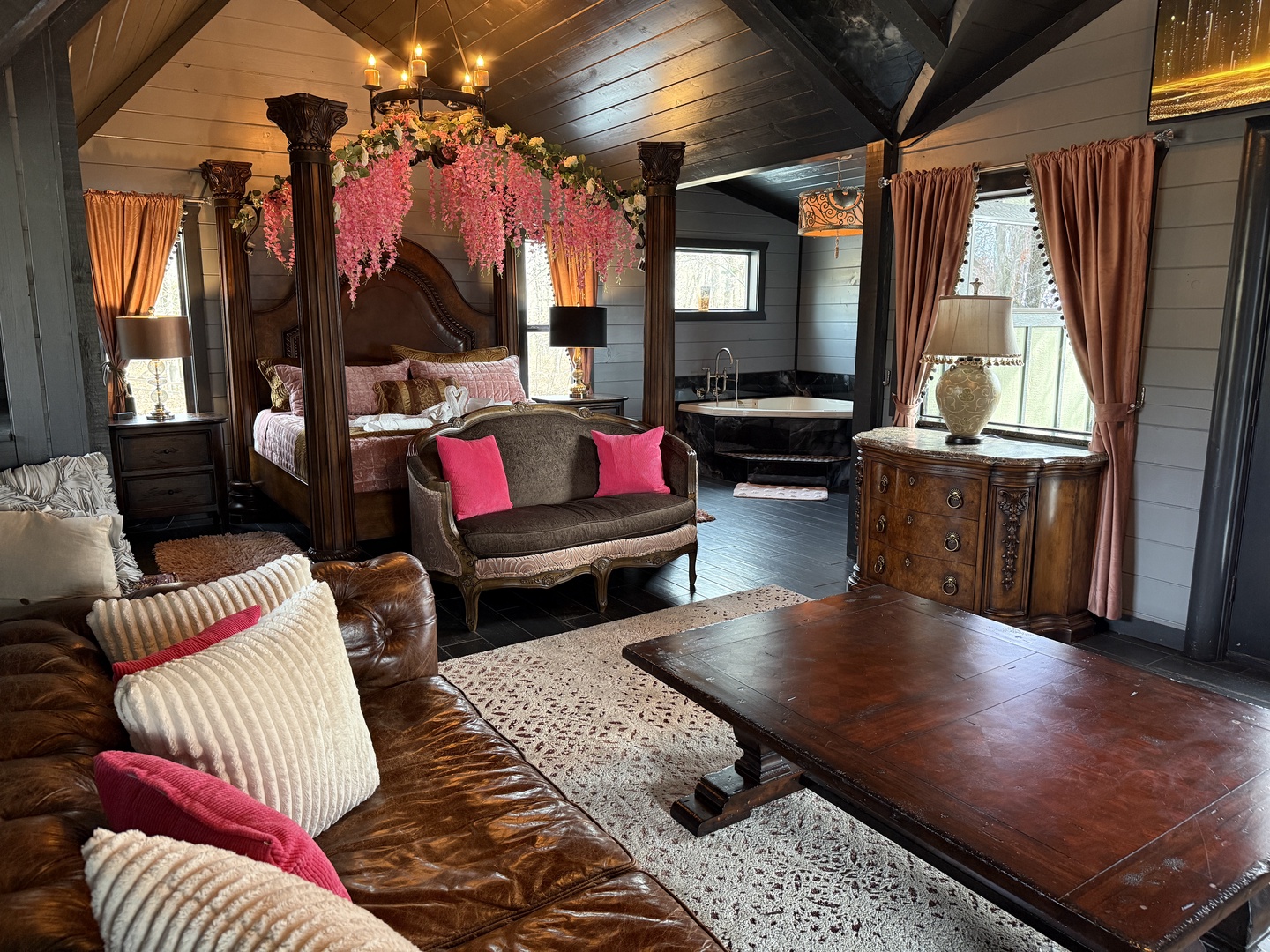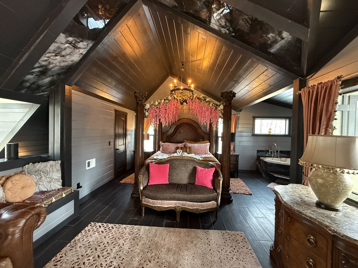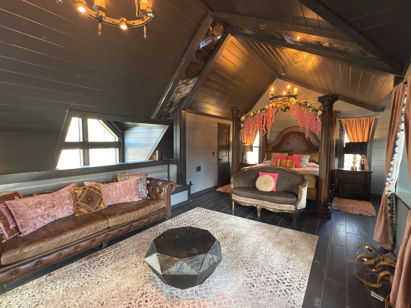 Welcome to Emerald City, a fully reimagined luxury cabin inspired by the darker elegance of Wicked and the mystique of Oz. Designed for Adults, this retreat blends modern gothic design, intentional craftsmanship, and indulgent comfort—created exclusively for couples seeking a bold, romantic escape.