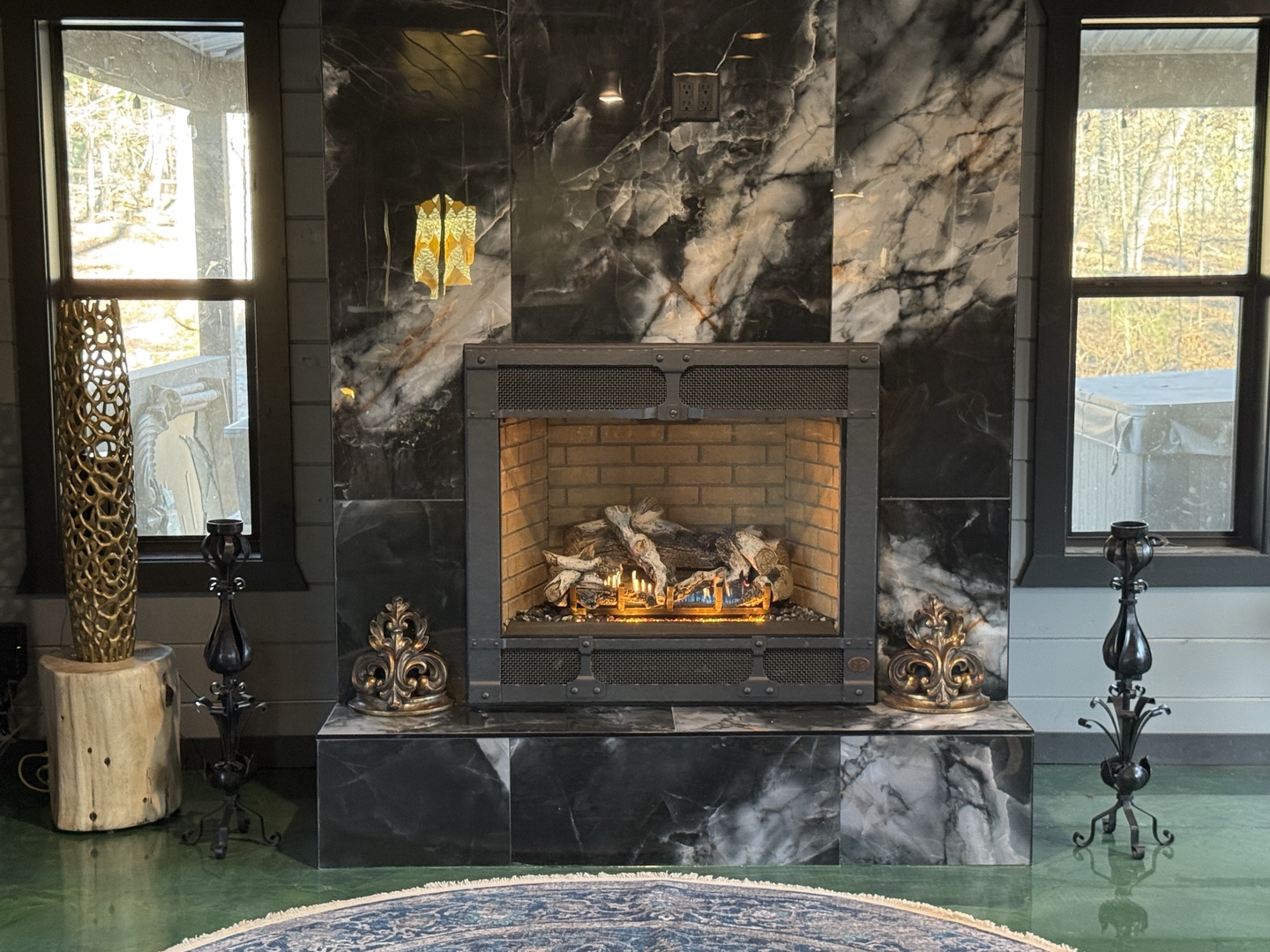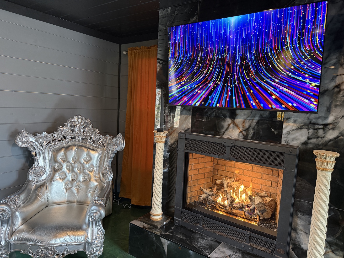 Mounted above the fireplace is a Samsung Smart TV, perfect for streaming your favorite platforms. (No cable or satellite service—streaming only.)