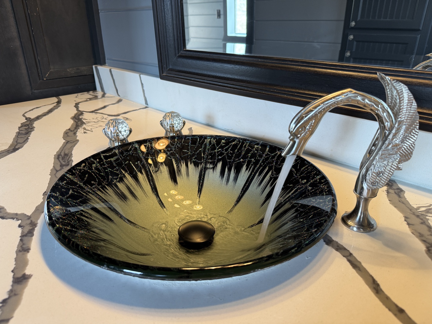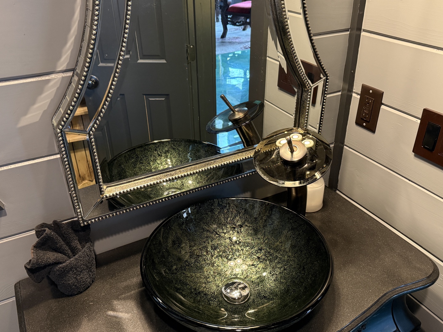 A whimsically modified furniture-piece vanity with Emerald Glass Vessel sink