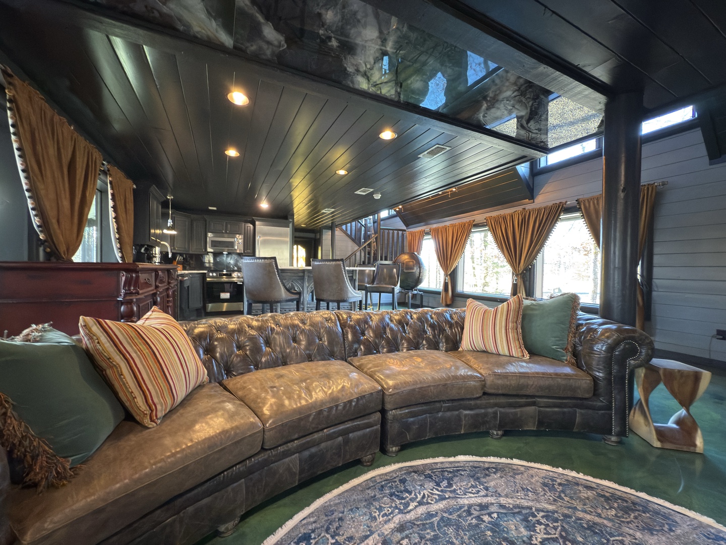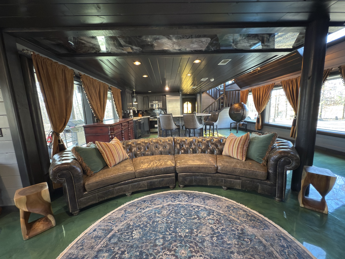 The heart of the cabin centers around a gas fireplace that functions as a true supplemental heat source, not merely ambiance. Curved around it is a striking 13-foot leather sofa by Hooker Furniture, designed to create a grand yet intimate fireside lounge.