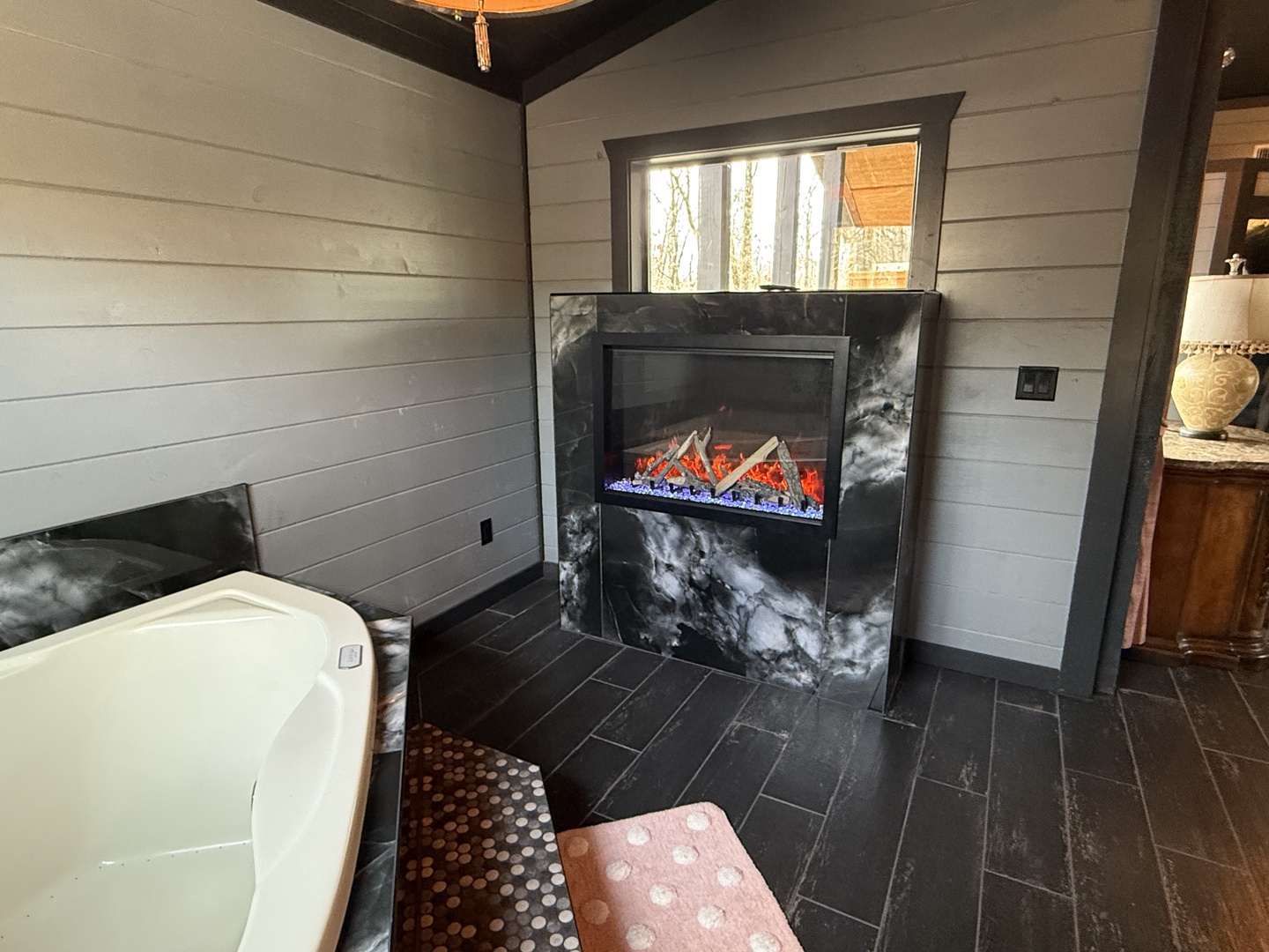 The Henredon Column Canopy King Bed and the luxurious AirBath tub are positioned side-by-side, both enjoying direct views of the electric fireplace, which features: