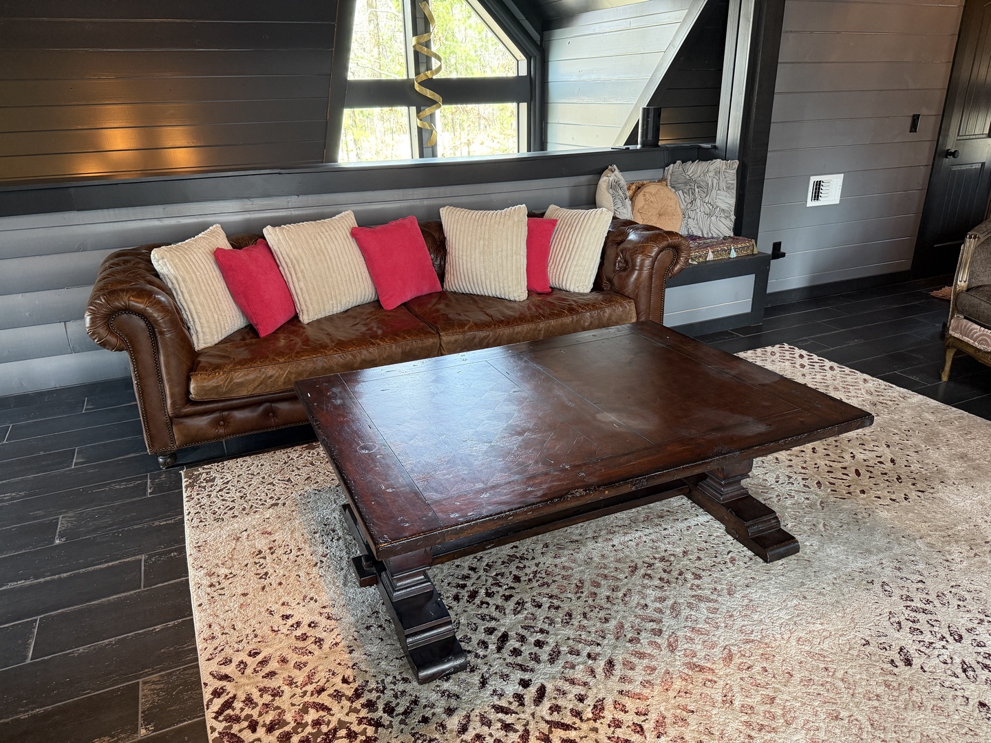 A 9-foot Restoration Hardware Chesterfield distressed leather sofa and Rachlin Classics Love Seat at the foot of the bed provides luxurious lounging upstairs. The fireplace is not visible from this seating area, creating distinct, purposeful zones within the suite.