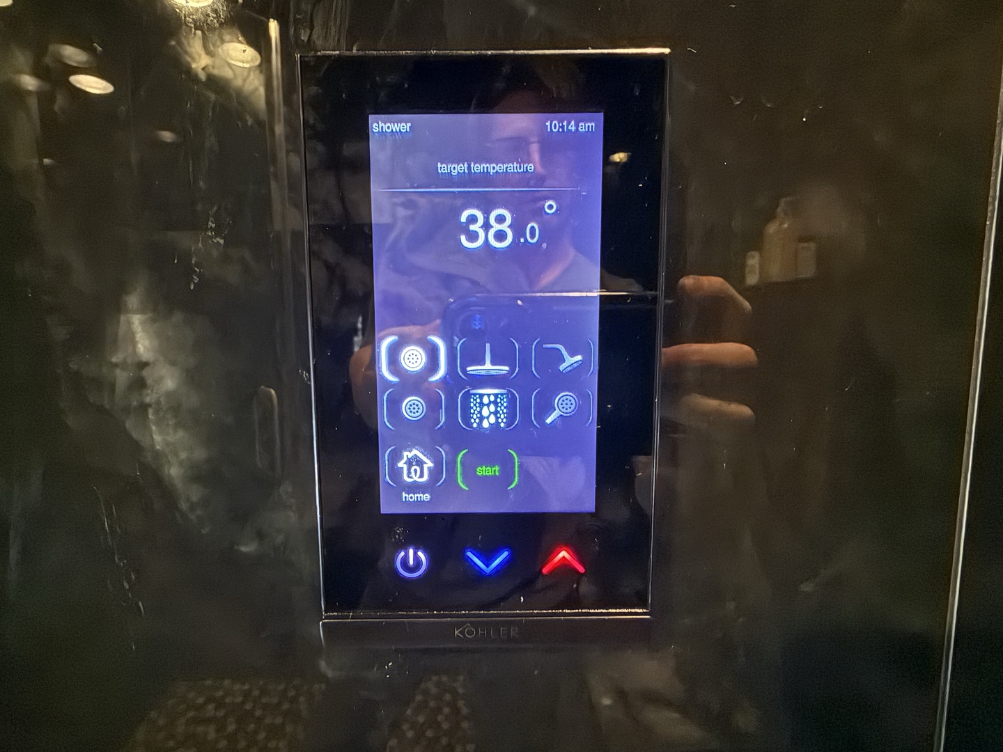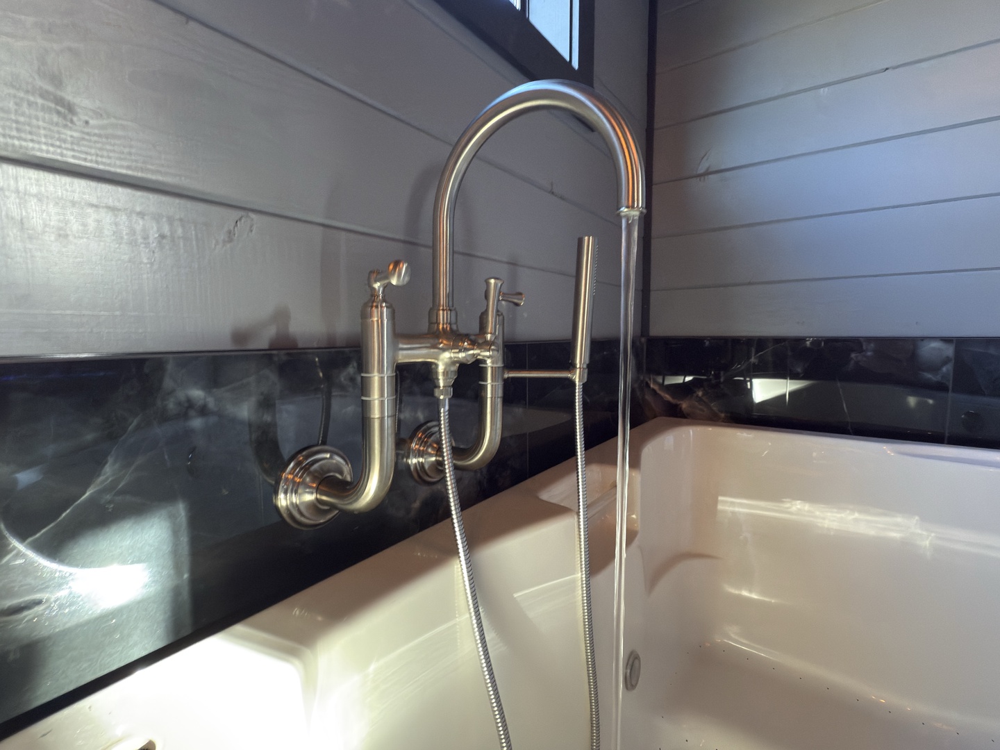 The primary upstairs bath has been elevated while preserving its premium plumbing configuration.