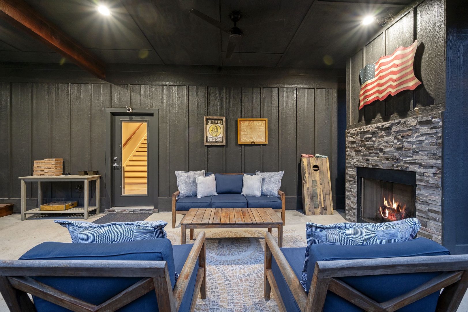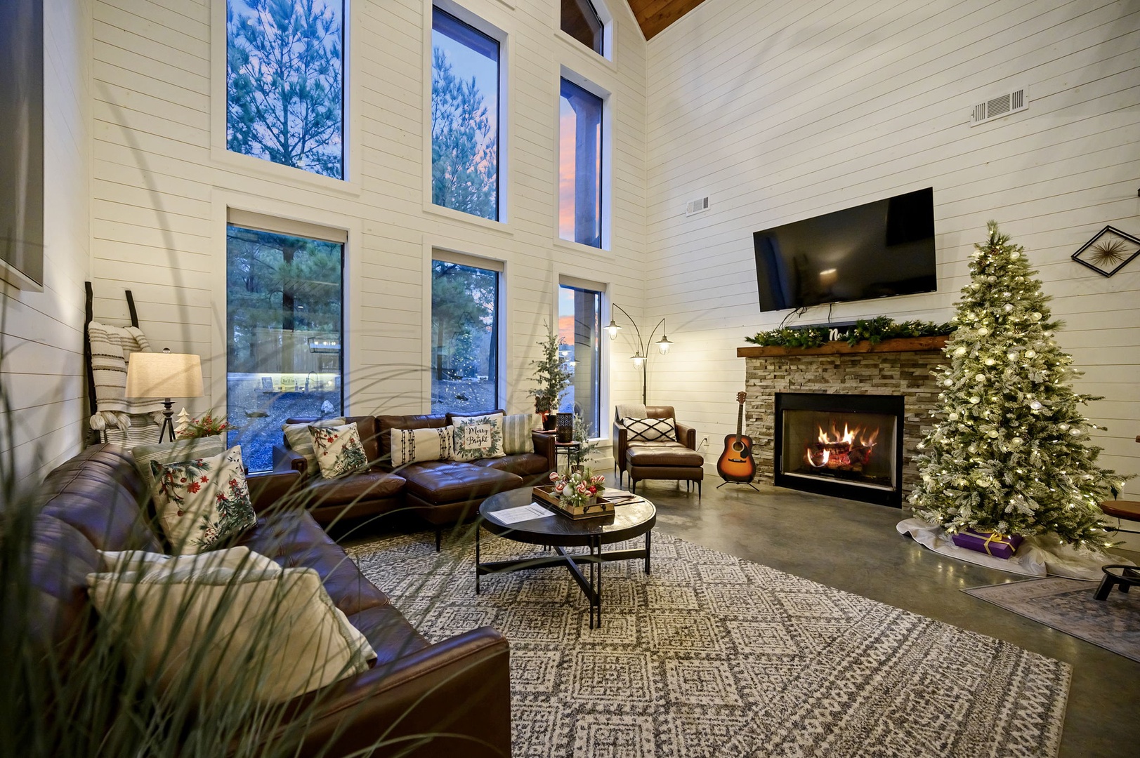 The easy transition to the living space makes it easy to visit with your family, as they sit around the gas fireplace or kick back on the couch and catch the game on the large flat-screen TV.