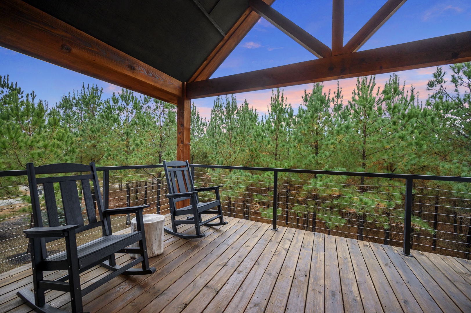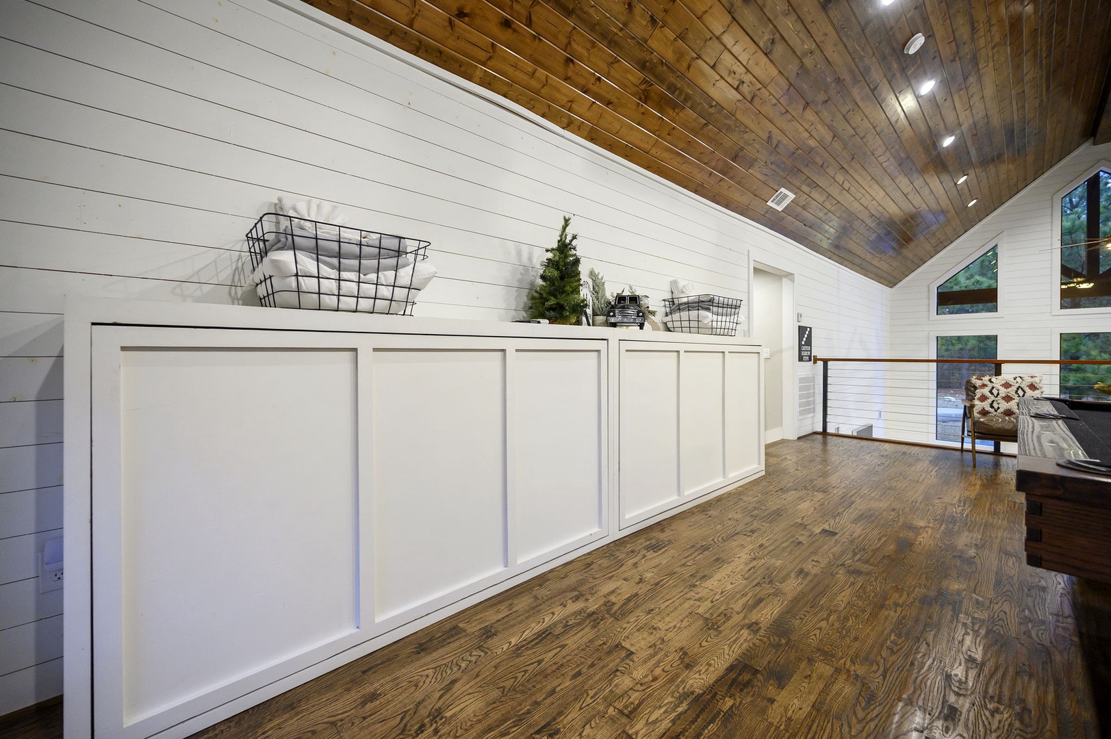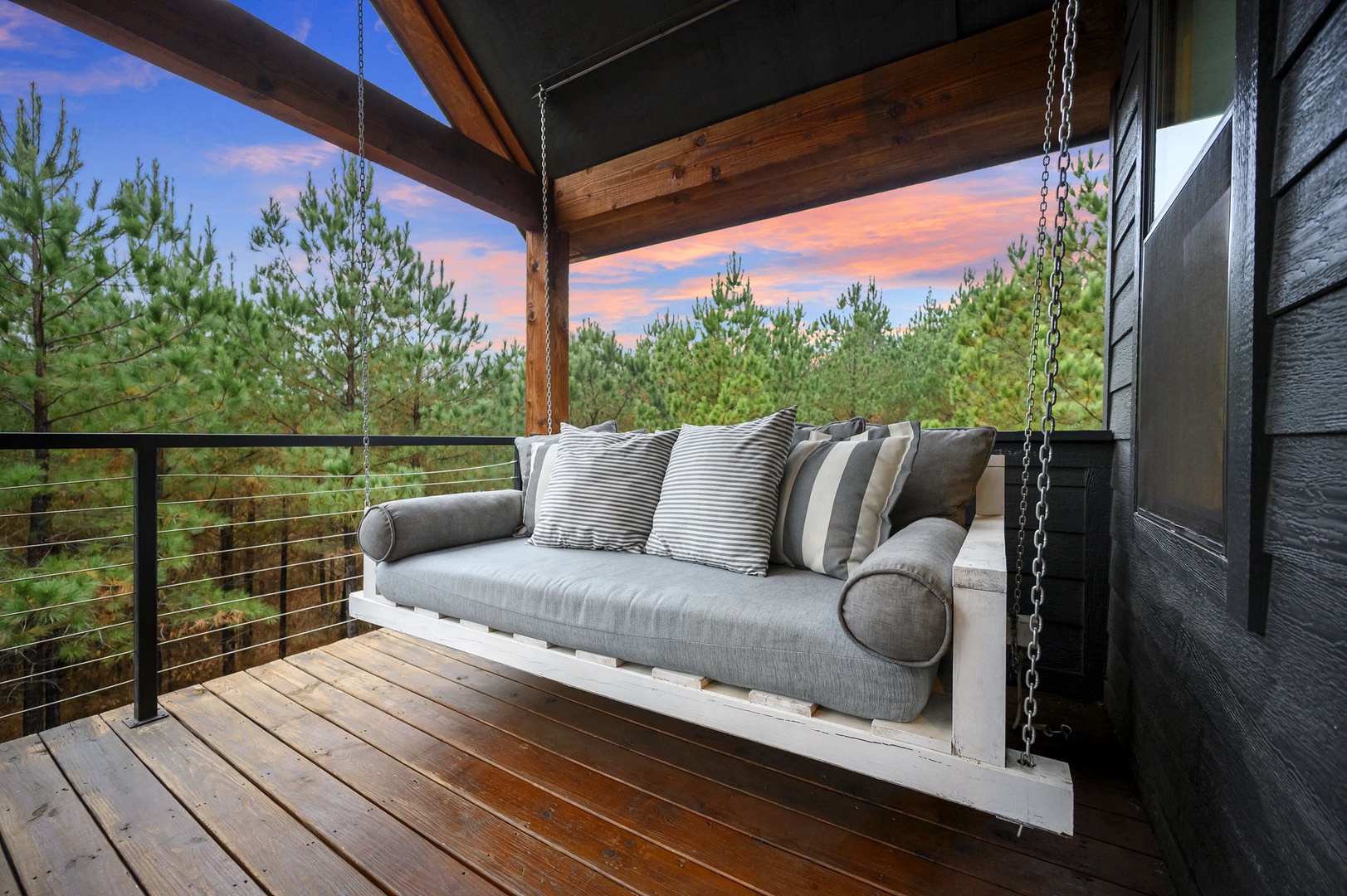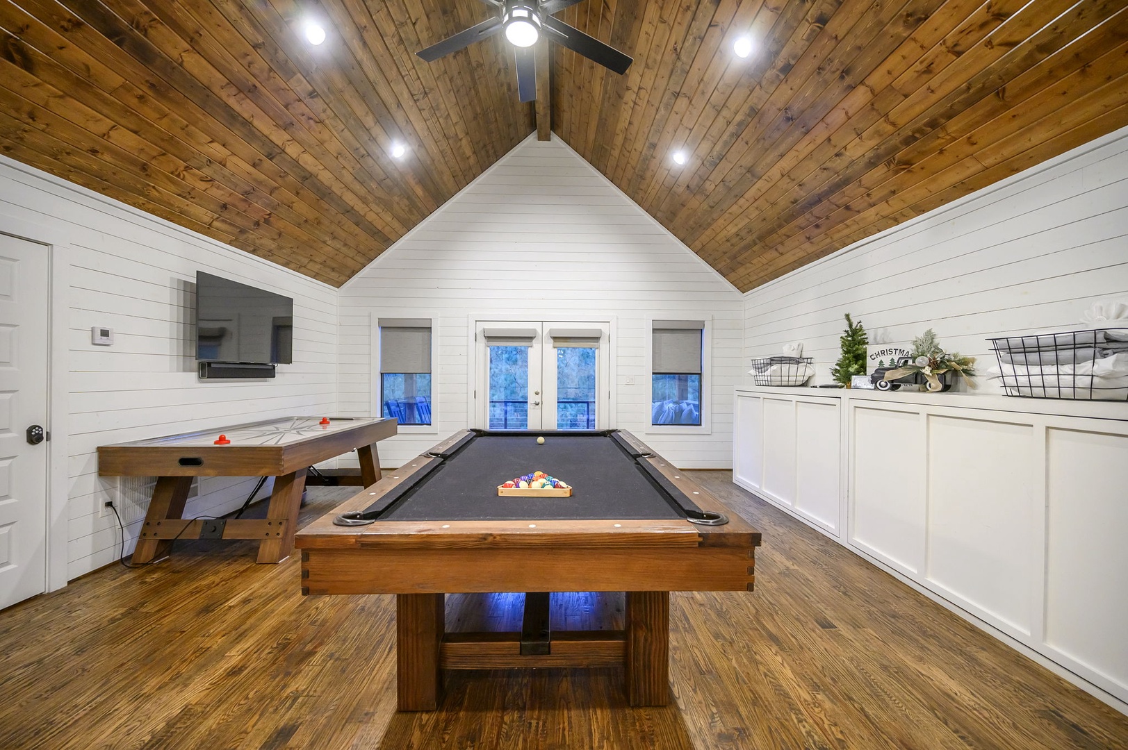 The upstairs space of Moonlight Pass has a spacious Loft Game Room with a full bathroom, air hockey, pool table, board games, and a flat screen TV with a sound bar. There you will find 2 twin murphy beds. There is also Balcony access with a hanging bed so you can relax and enjoy the view.