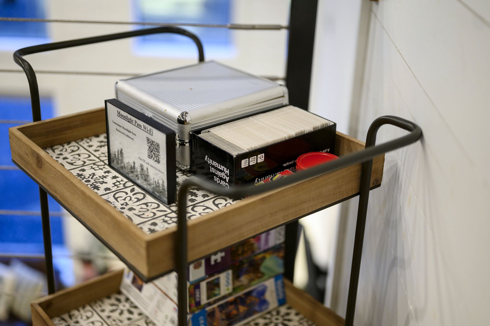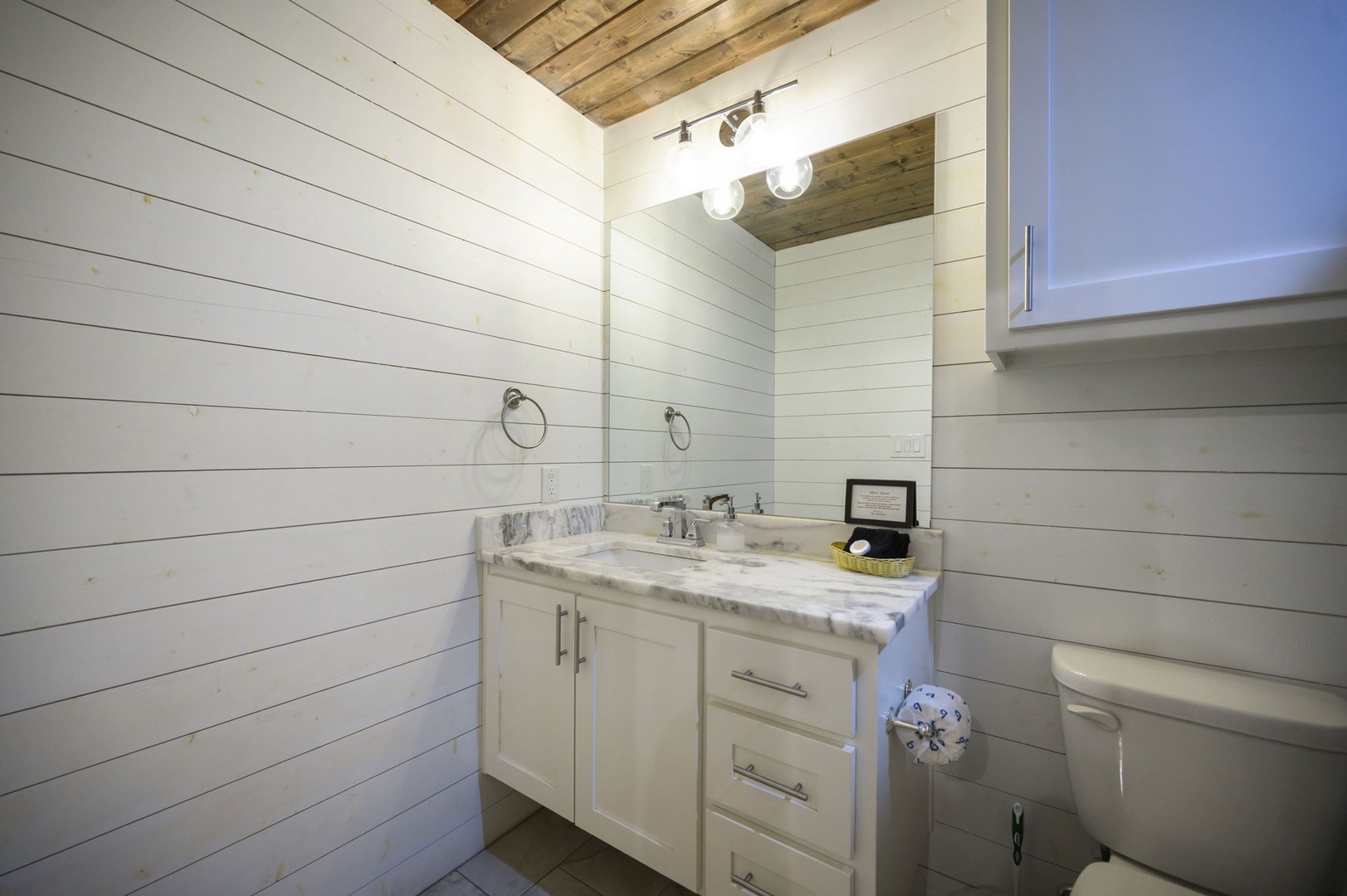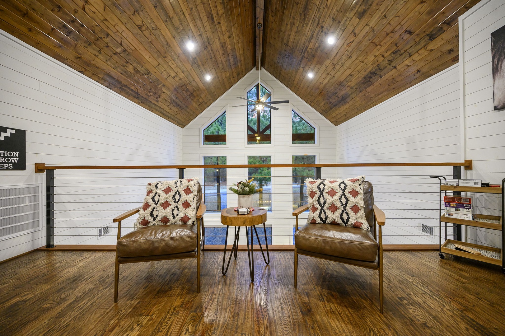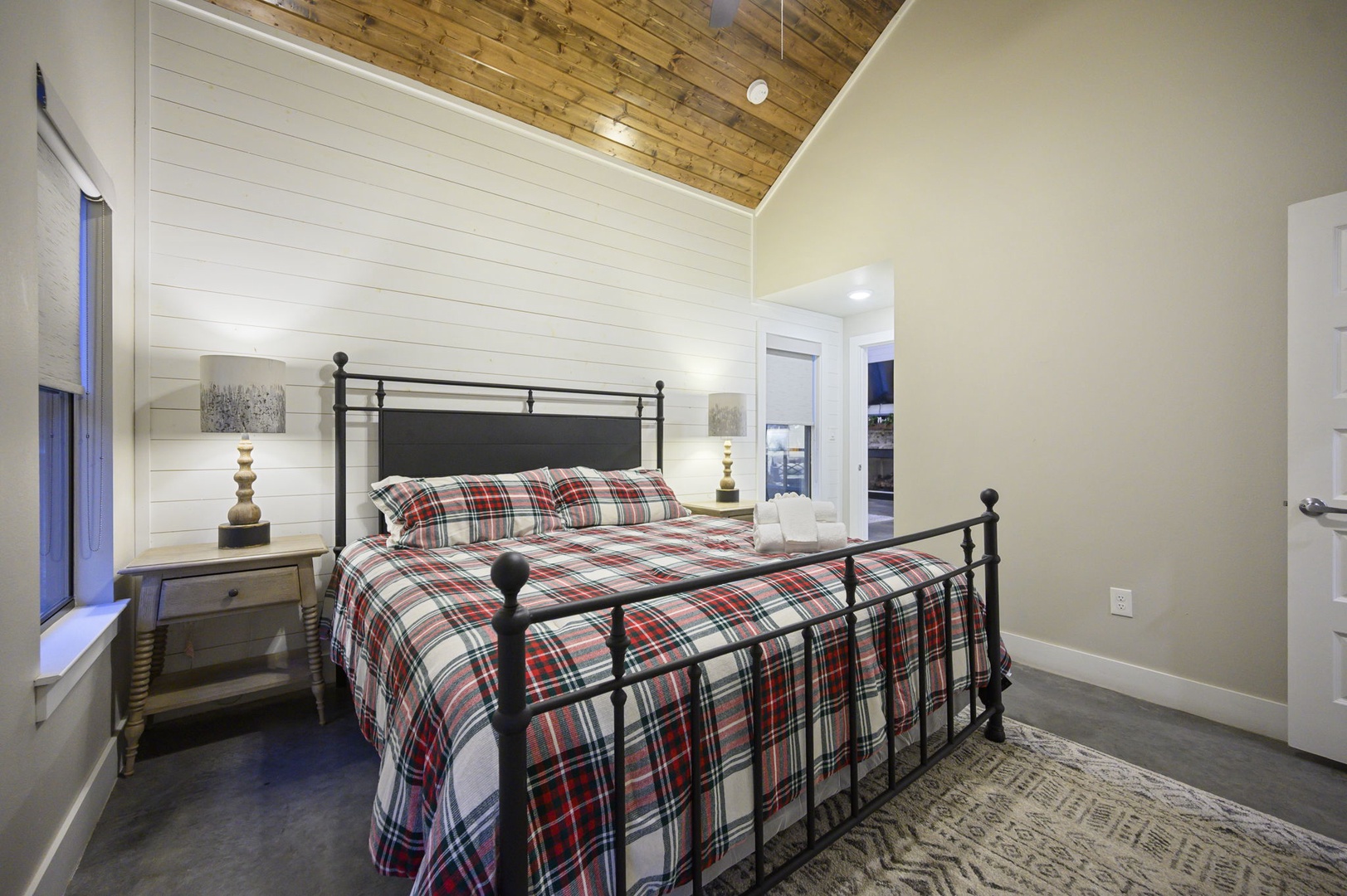 The upstairs space of Moonlight Pass has a spacious Loft Game Room with a full bathroom, air hockey, pool table, board games, and a flat screen TV with a sound bar. There you will find 2 twin murphy beds. There is also Balcony access with a hanging bed so you can relax and enjoy the view.