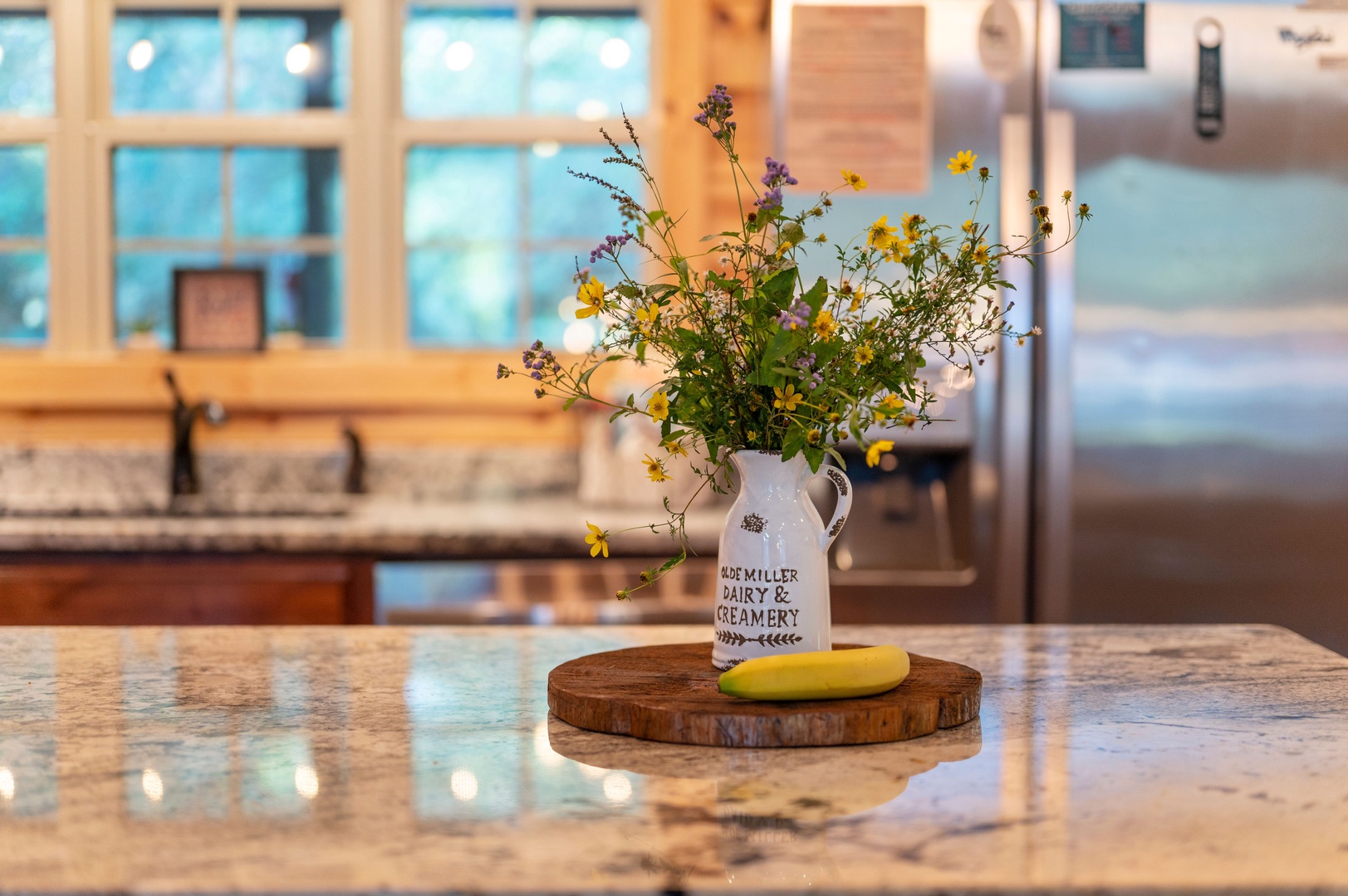 The heart of the cabin is its open-concept living area, seamlessly connecting the fully equipped kitchen with its exquisite granite countertops and rich, dark cabinetry. The island bar is perfect for casual dining or entertaining, allowing everyone to gather and enjoy the culinary experience.
