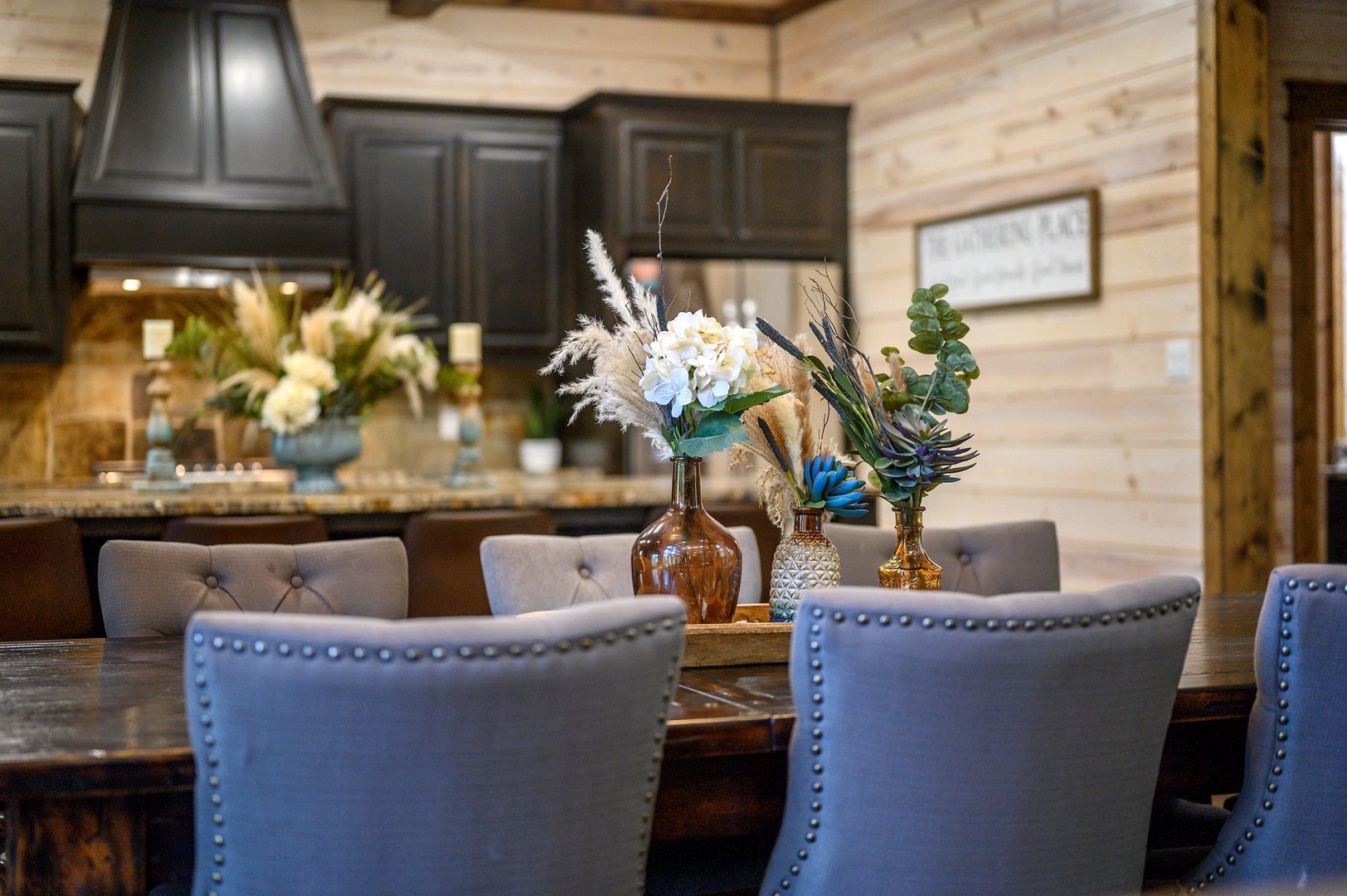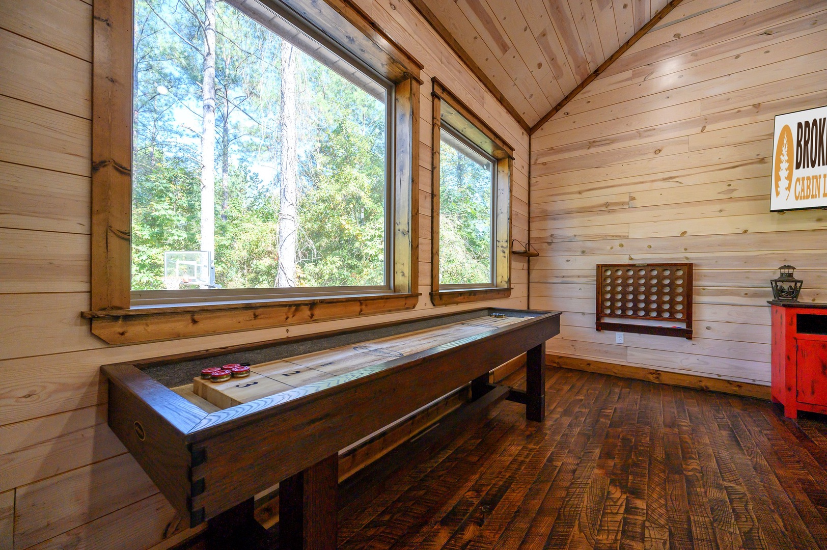 Sunset Daze is a luxury cabin in Hochatown, sleeping up to 24 guests in 5 bedrooms and 5.5 baths. The cabin features a grand living room with a fireplace, a fully equipped kitchen with granite countertops, and a game room with ping pong and arcade games. Upstairs, find a bunk room with eight queen beds.