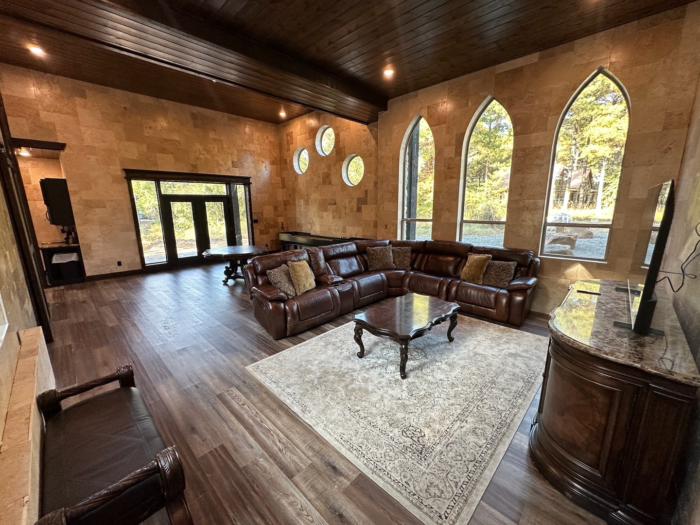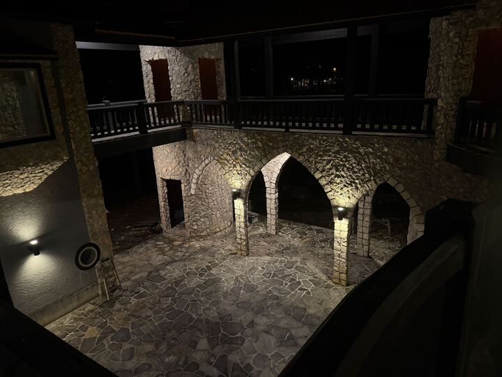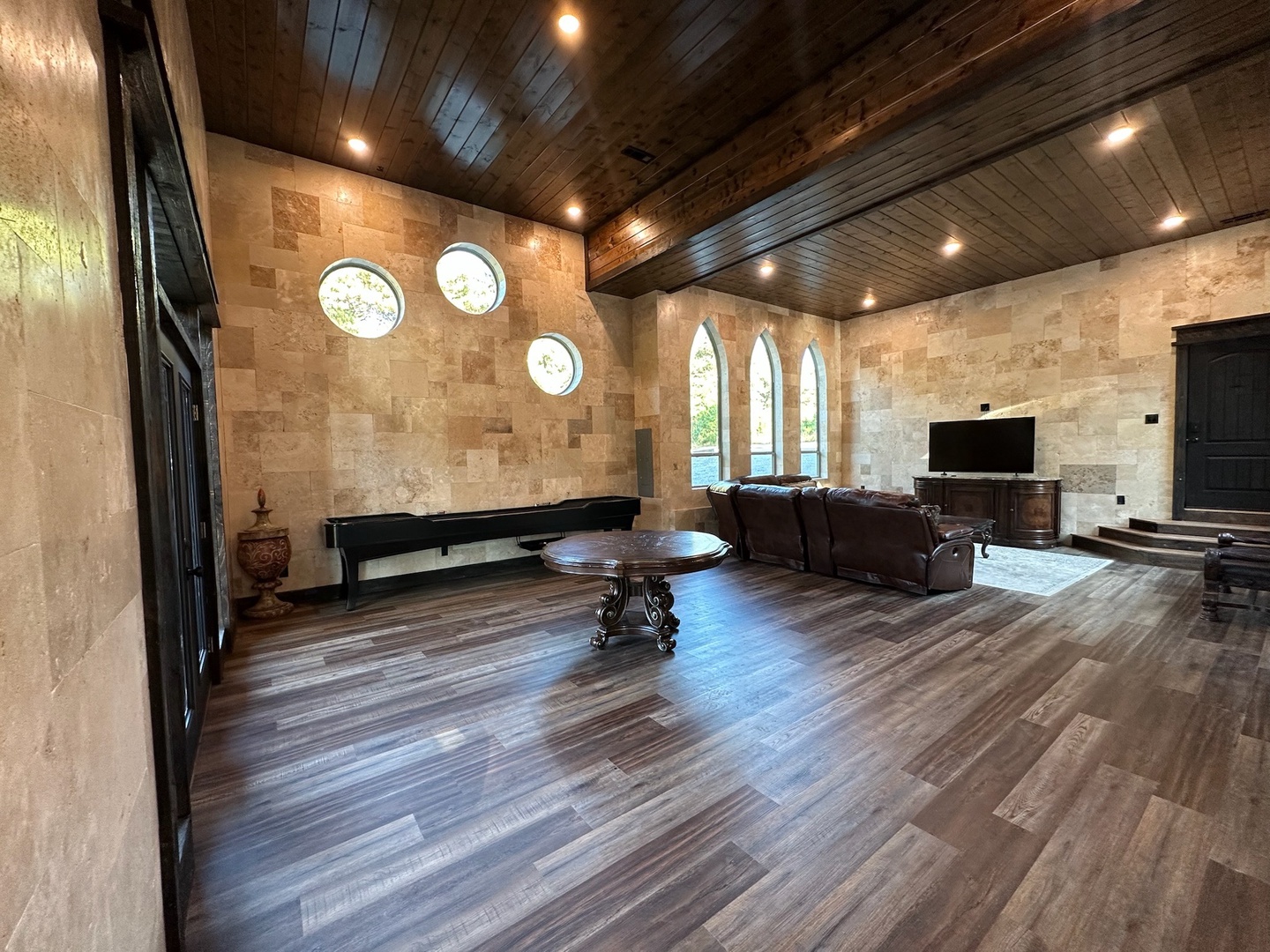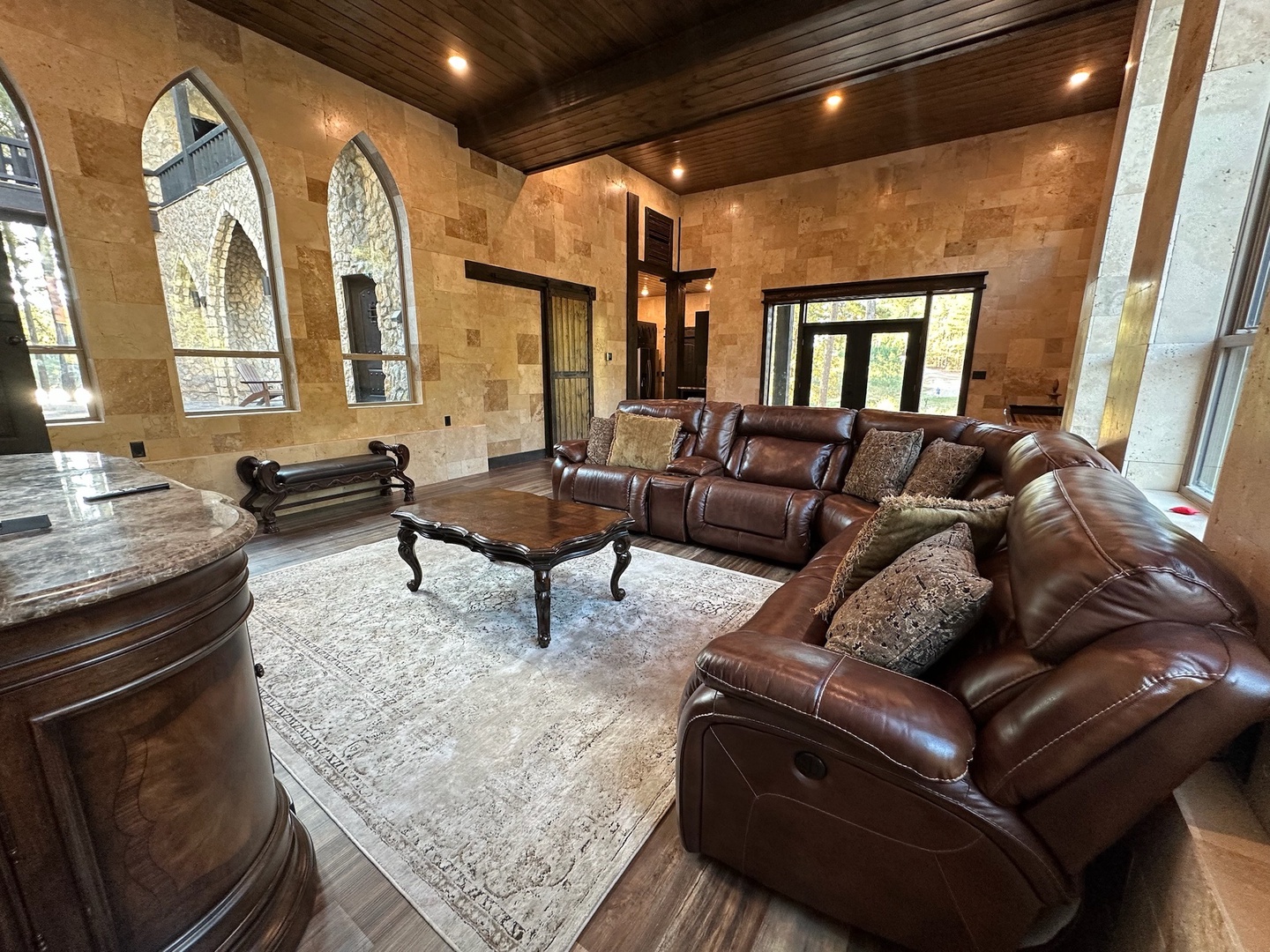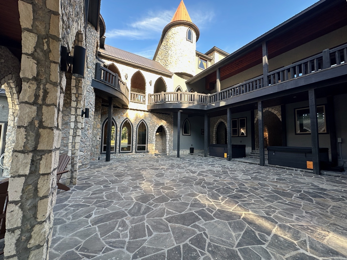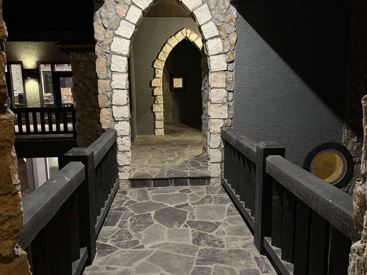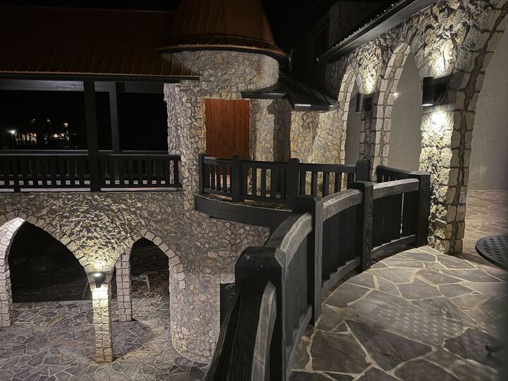 Back outside we cross the courtyard to find the World Cup game room. An imposing stone corridor connects to the parking area to the game room and courtyard. Featuring a Pool Table, 12 foot Shuffleboard, Arcade Table, community table seating and a large sofa for viewing the 65" TV, the World Cup room is the perfect place to hang out. Double doors open to the pond steps away. The Game Room is equipped with its own galley service kitchen great for convenience when hanging out or for servicing large events with its own direct access out the back of the Castle. There is also a set of stackable laundry machines tucked away as guests step up into the Pensive Bath. The Pensive bath is a half bath with direct access to the courtyard as well.