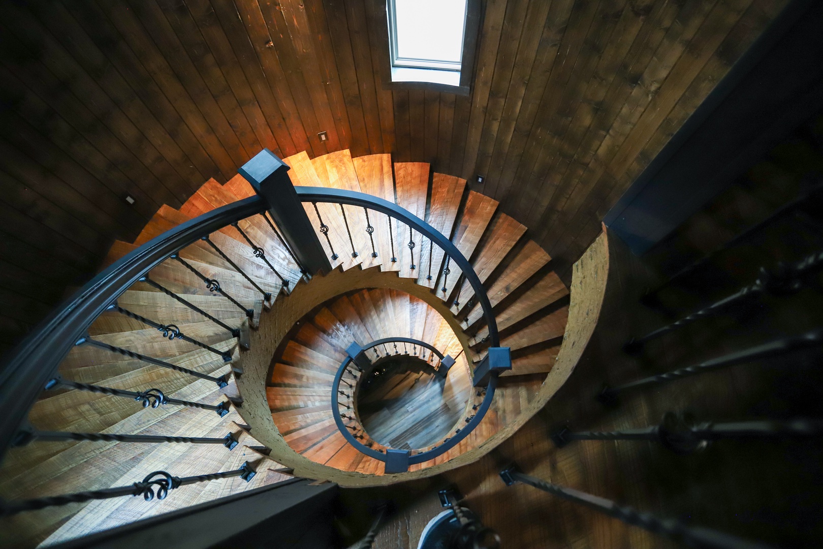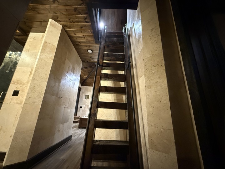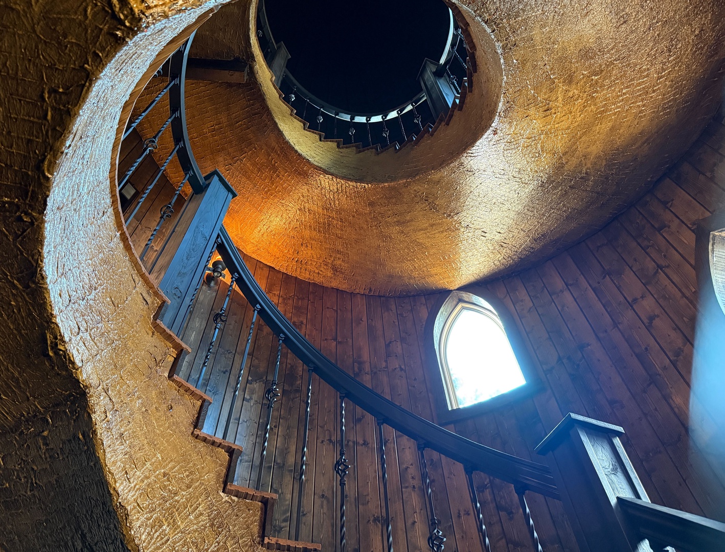 Ascend the turret stairs to the second level entrance to the Great Hall and Kitchen.