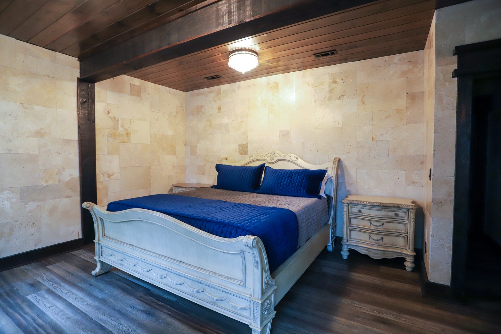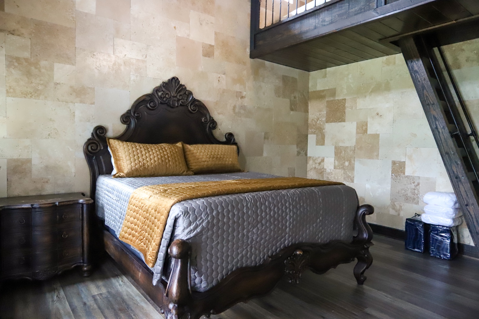 Victor's chambers are across the hallway. A vi-King bed awaits in the cool, dark suite. A nook with 2 queens is tucked away in the corner with drapery to be drawn for privacy. The suite is complete with water closet, stunning shower and vanity area.