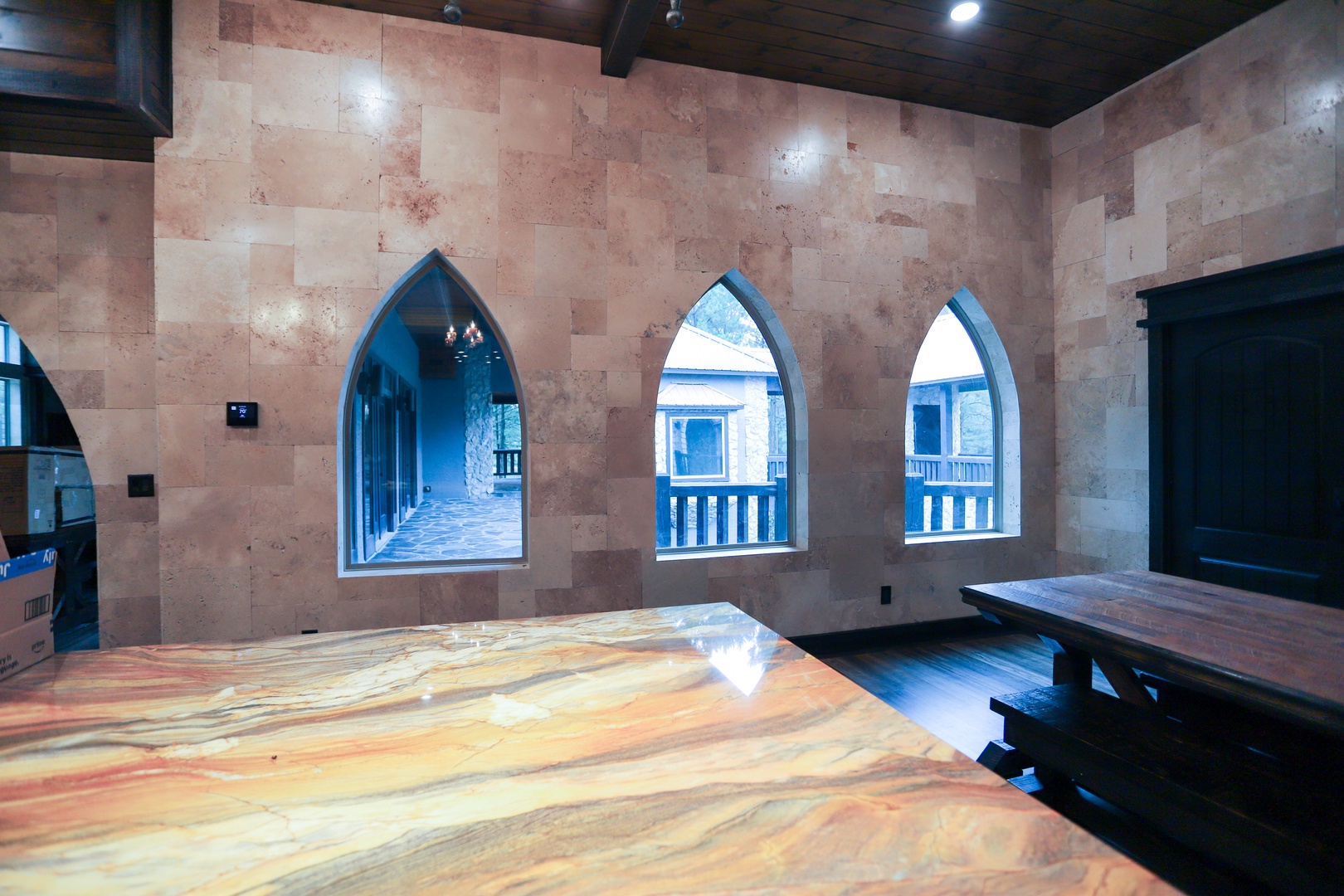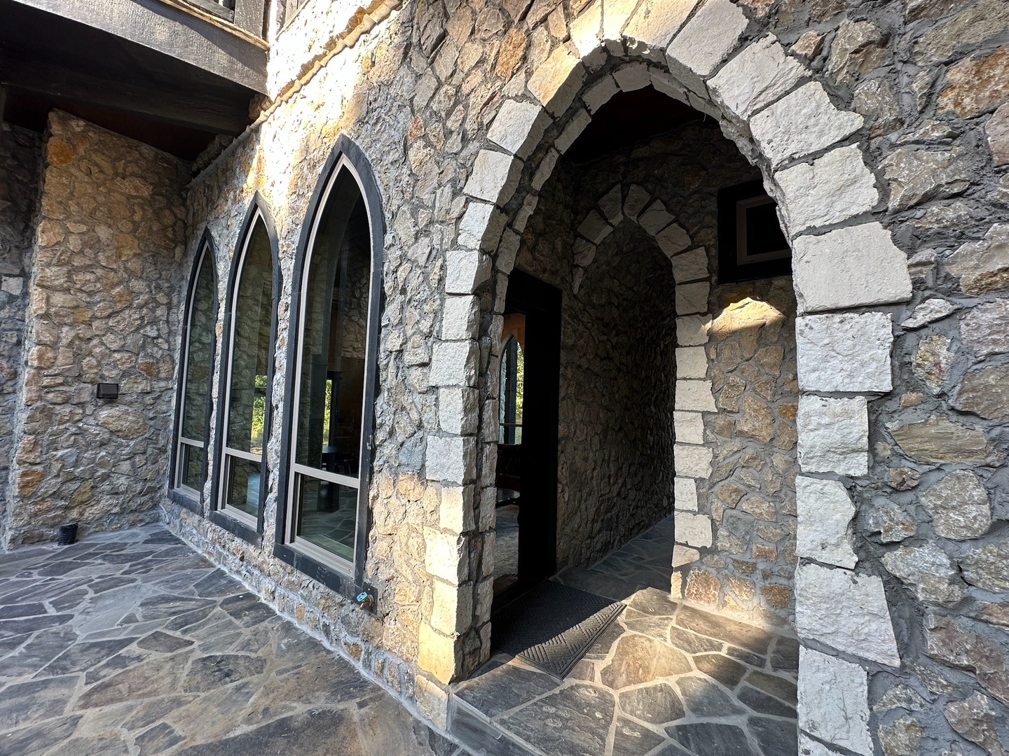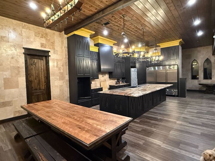 The kitchen is equipped with commercial appliances for preparing feasts! Double oven with convection microwave, 48 inch gas range, a pair of dishwashers, 78 inch three door refrigerator, 24 inch freezer column and an ice making machine There's a dedicated pantry, 14 foot island with seating for 6 and a breakfast table for 8. The kitchen is loaded with prep space, gadgets, gizmos and gourmet gear for chefs to concoct unbelievable cuisines. There's a half bath off the kitchen that represents the earthy House of Badgers with an ounce of opulence. The kitchen has an adjacent outdoor cooking area featuring a gas grill, Blackstone Griddle and outdoor food prep area. Covered steps provide direct access to the parking area for catering access. A pair of massive Arches lined with blackout thermal drapes offer easy separation from the preparation to minimize disruption during large events.