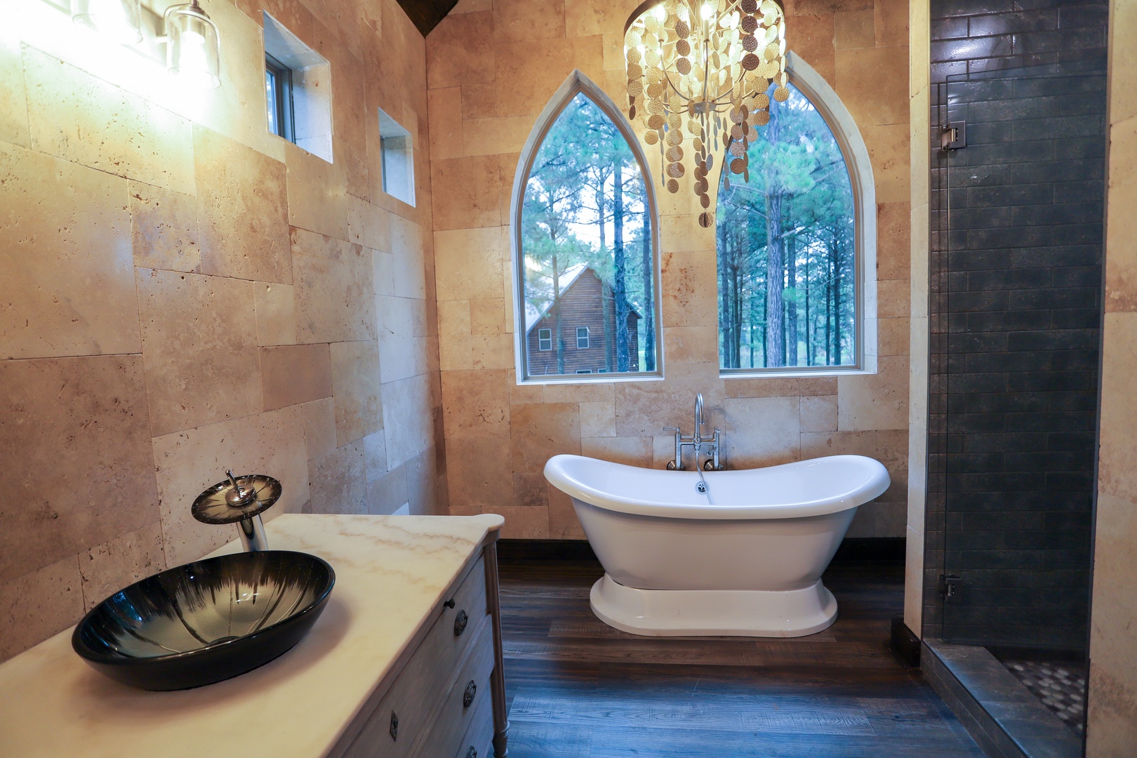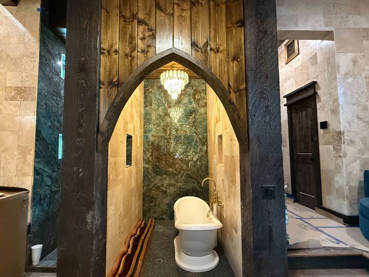 Custom Showers, super cool custom vanities converted from ornate castle furniture, and a color pallet inspired by all things related to the fiery Goblet.
