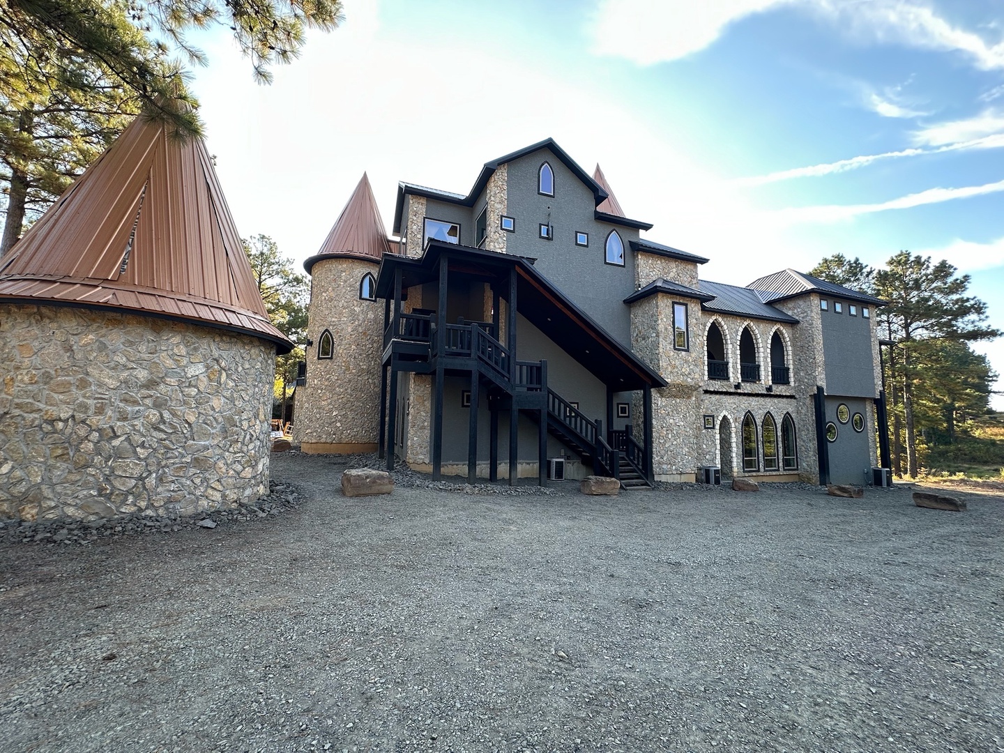 Behind the bar is a menagerie of manacles melded together for a marvelous Master Suite with a King Bed that will enhance anyone's Mood. The bath has a soaking tub mounted under a pair of massive arched windows and a minty cool shower. There is a semi-private loft quarters with 2 twin beds, sitting area and writing turret. This suite also has an alternate exit onto a covered outdoor seating area.