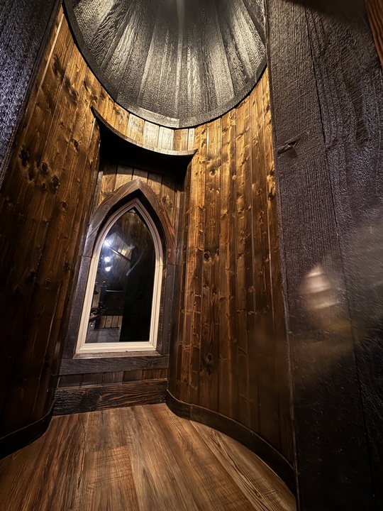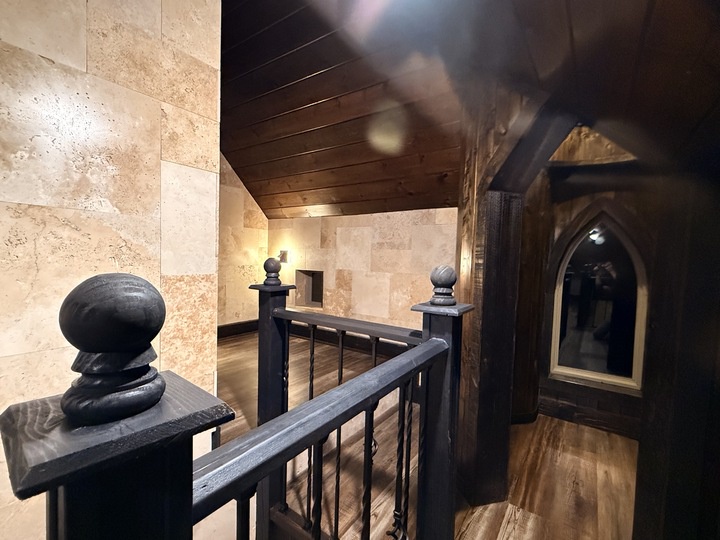 After entering into a stairwell that travels down to the Maze Lounge, guests can enjoy common area with an electric fireplace. Harry's cupboard under the stairs contains a twin bed adjacent to a half bath hidden in this area. The Maze Lounge has exits to the courtyard and side escape steps, as well as indoor access to the chambers of Fluer and Victor.
