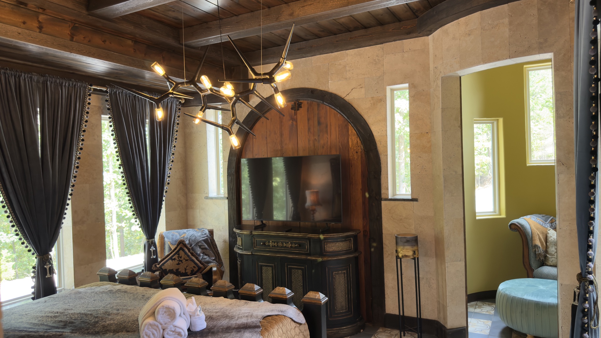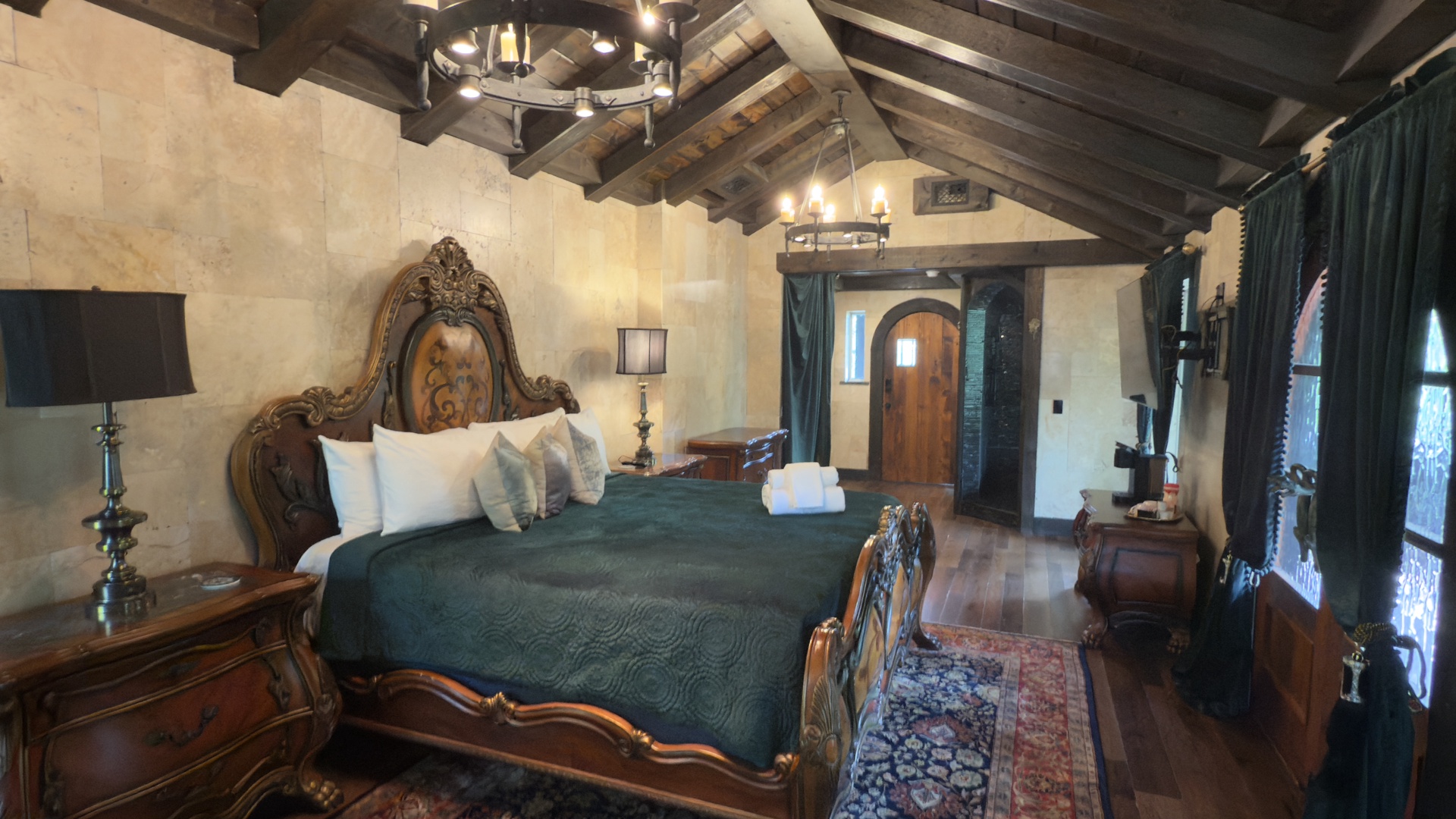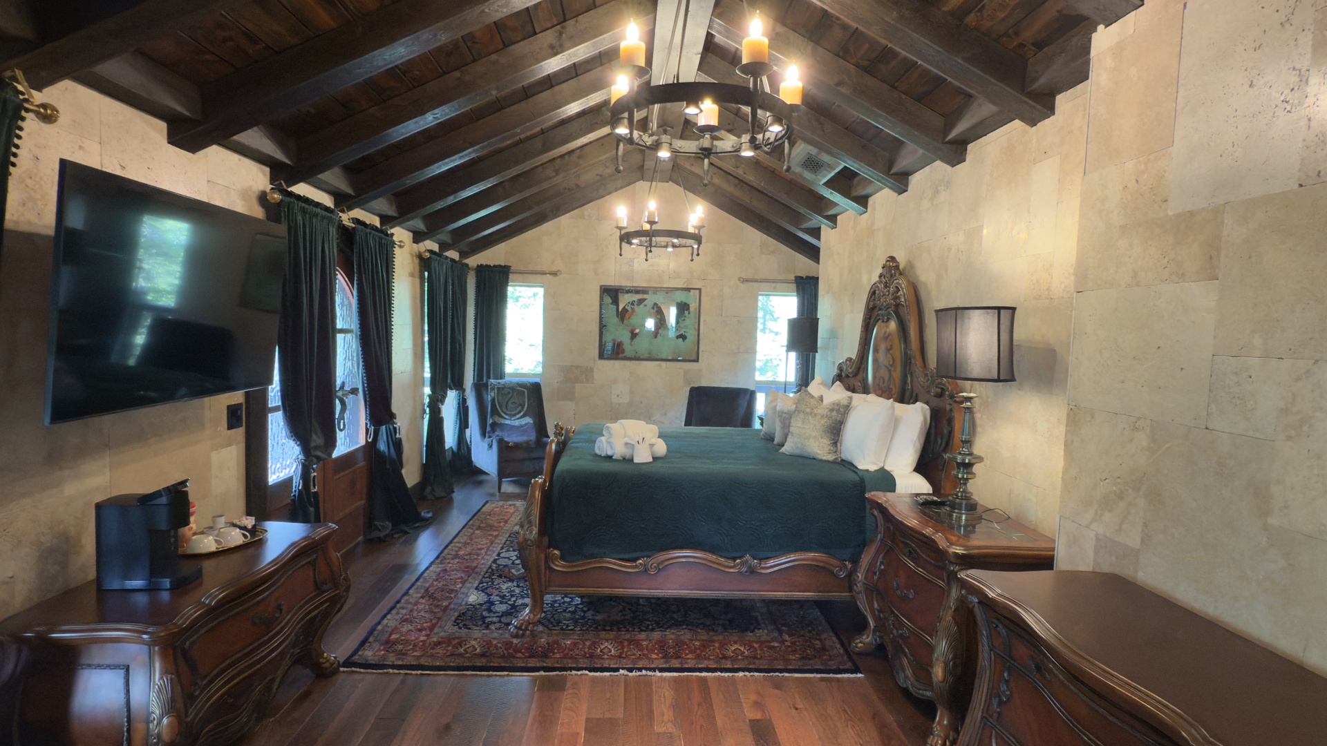 The Sorcerer offers 5 king suites, 2 half baths, multi-level living and outdoor areas, lounging pool and is surrounded by the forest. The 5 kings bedroom suites are designed specifically for adults seeking an unforgettable sabbatical from the dreary world devoid of magic. Each suite has its own private access and separation from the others. The Sorcerer's rooms are each inspired by the 4 magical houses and other important scenes from the famous wizarding story. Each suite has its own coffee station for guests to get their early morning cup of courage, determination, cunning and creativity.