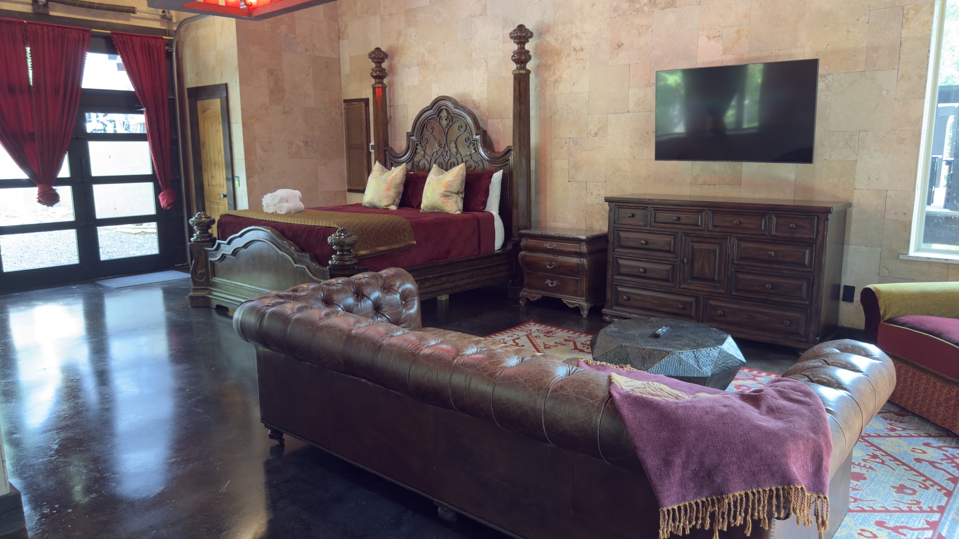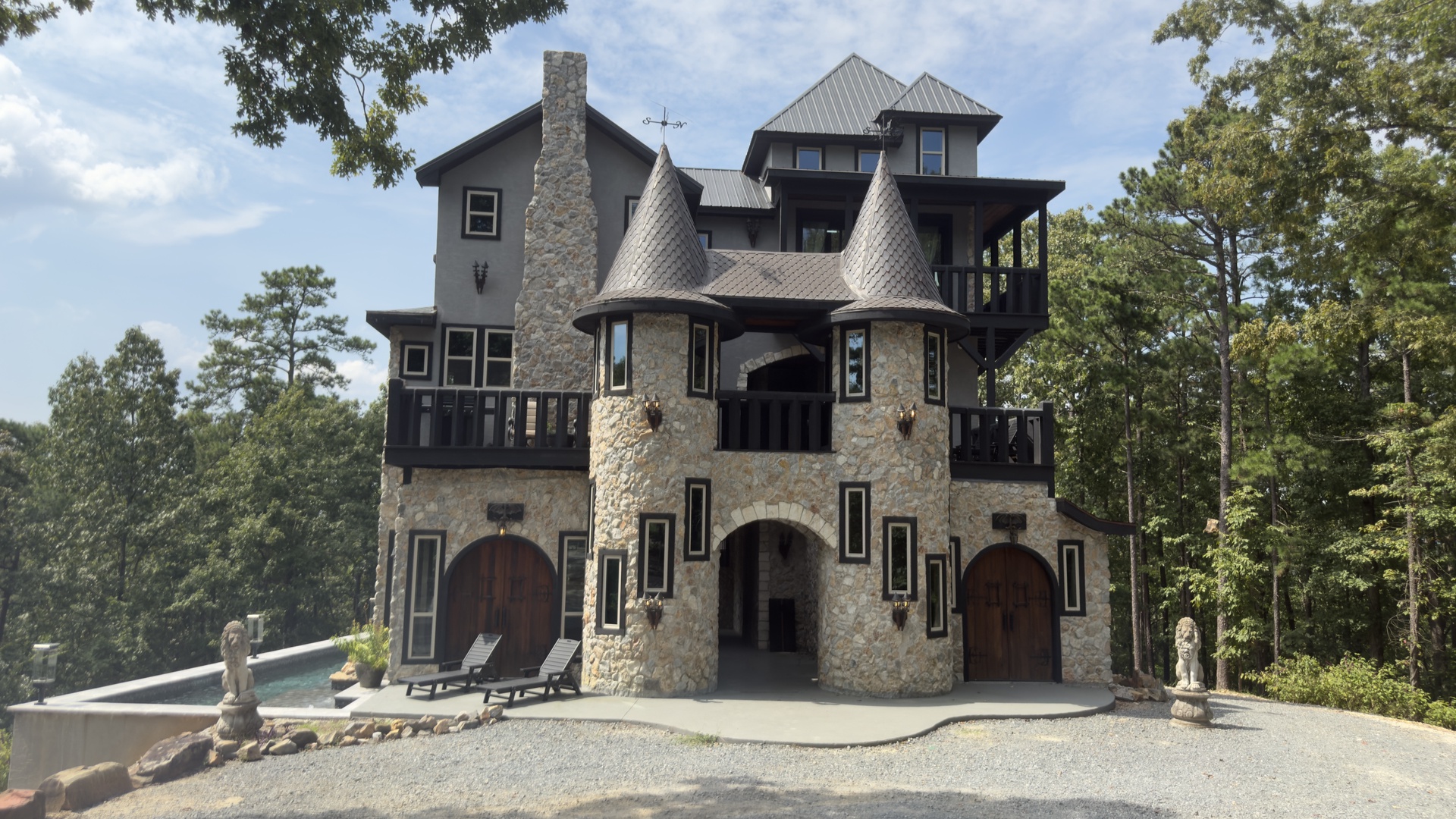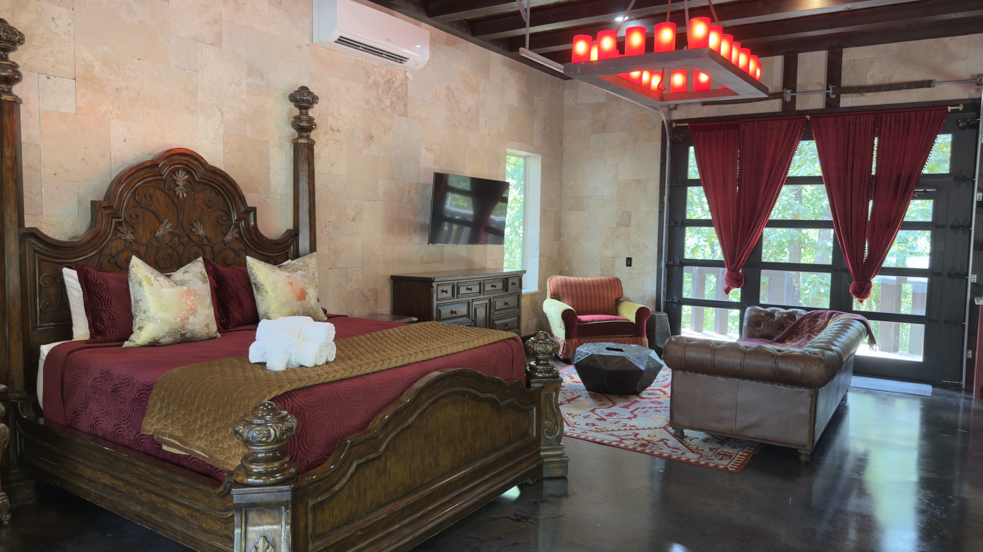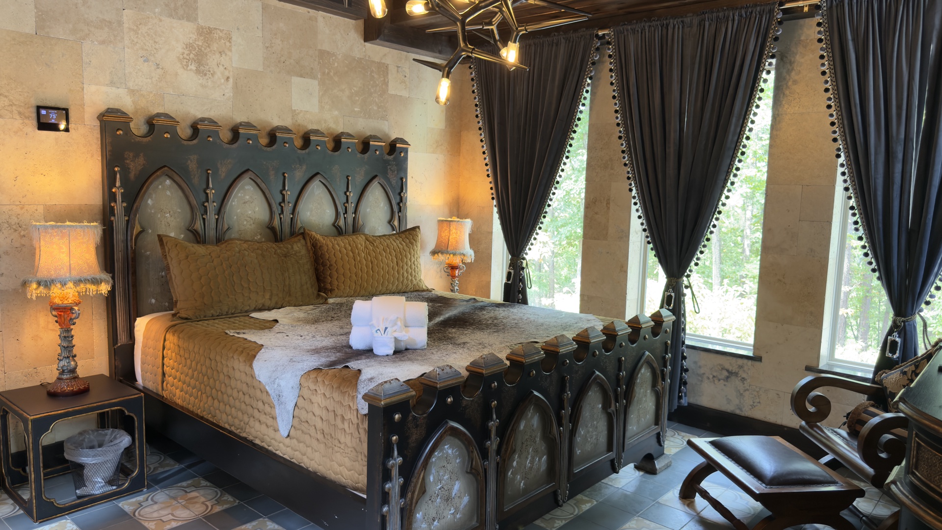 The Sorcerer offers 5 king suites, 2 half baths, multi-level living and outdoor areas, lounging pool and is surrounded by the forest. The 5 kings bedroom suites are designed specifically for adults seeking an unforgettable sabbatical from the dreary world devoid of magic. Each suite has its own private access and separation from the others. The Sorcerer's rooms are each inspired by the 4 magical houses and other important scenes from the famous wizarding story. Each suite has its own coffee station for guests to get their early morning cup of courage, determination, cunning and creativity.