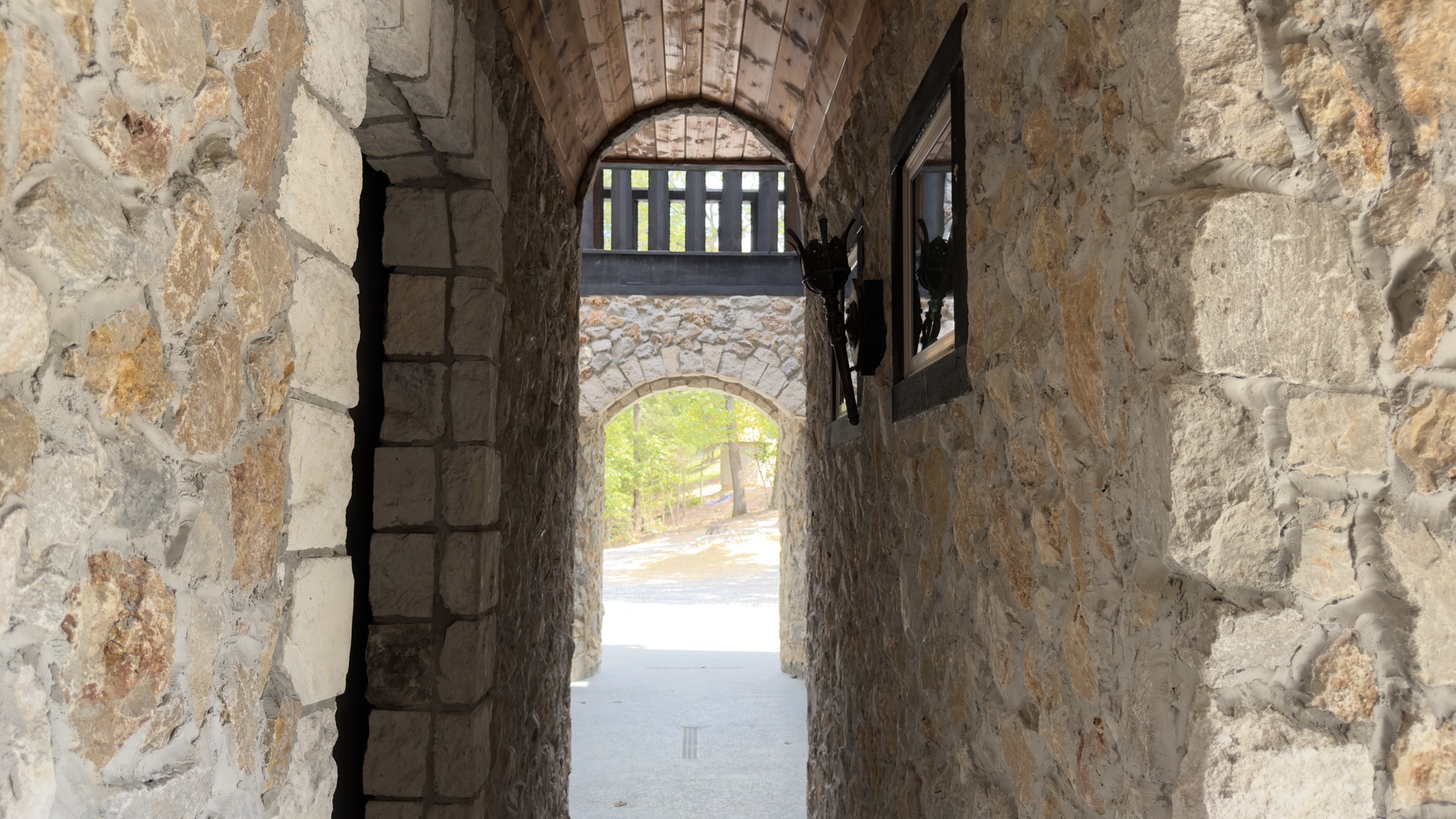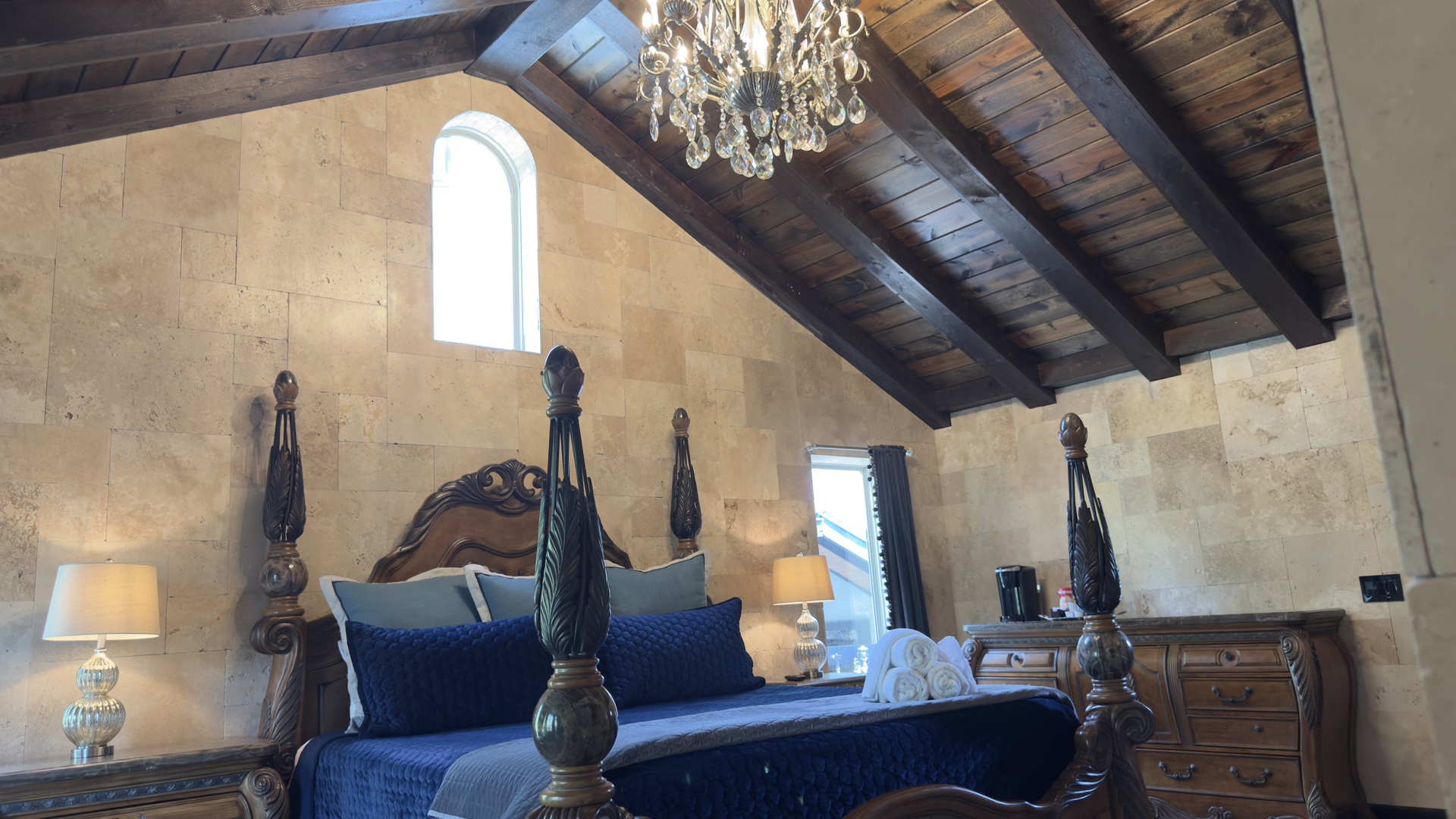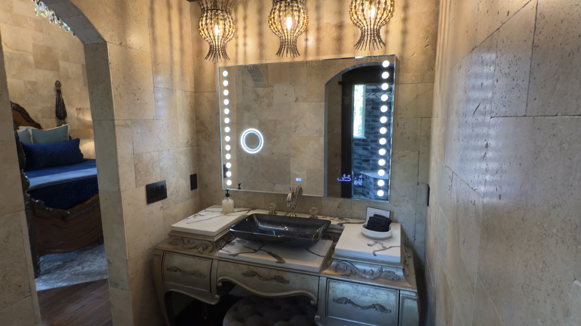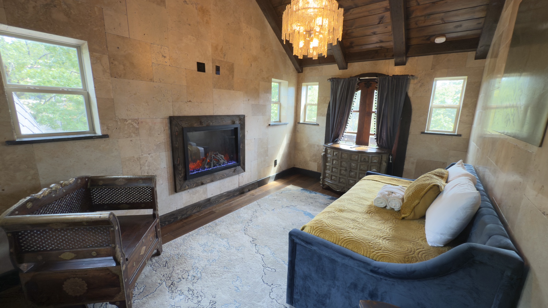 Beyond the courtyard, up the stairs and to the left, 2 additional suites await. First is The Raven. Smart, cool, calm and collected guests will dig their claws into this house. The bathroom vanity is adorned with a smart mirror flanked by built in Hollywood lights perfect for the head of house to adjust their Diadem. Beyond, is a vaulted turret that is home to a custom shower with body sprays and spectacular views into the forest. Those who nest here have access to a mostly private deck with stunning forest and lake views.