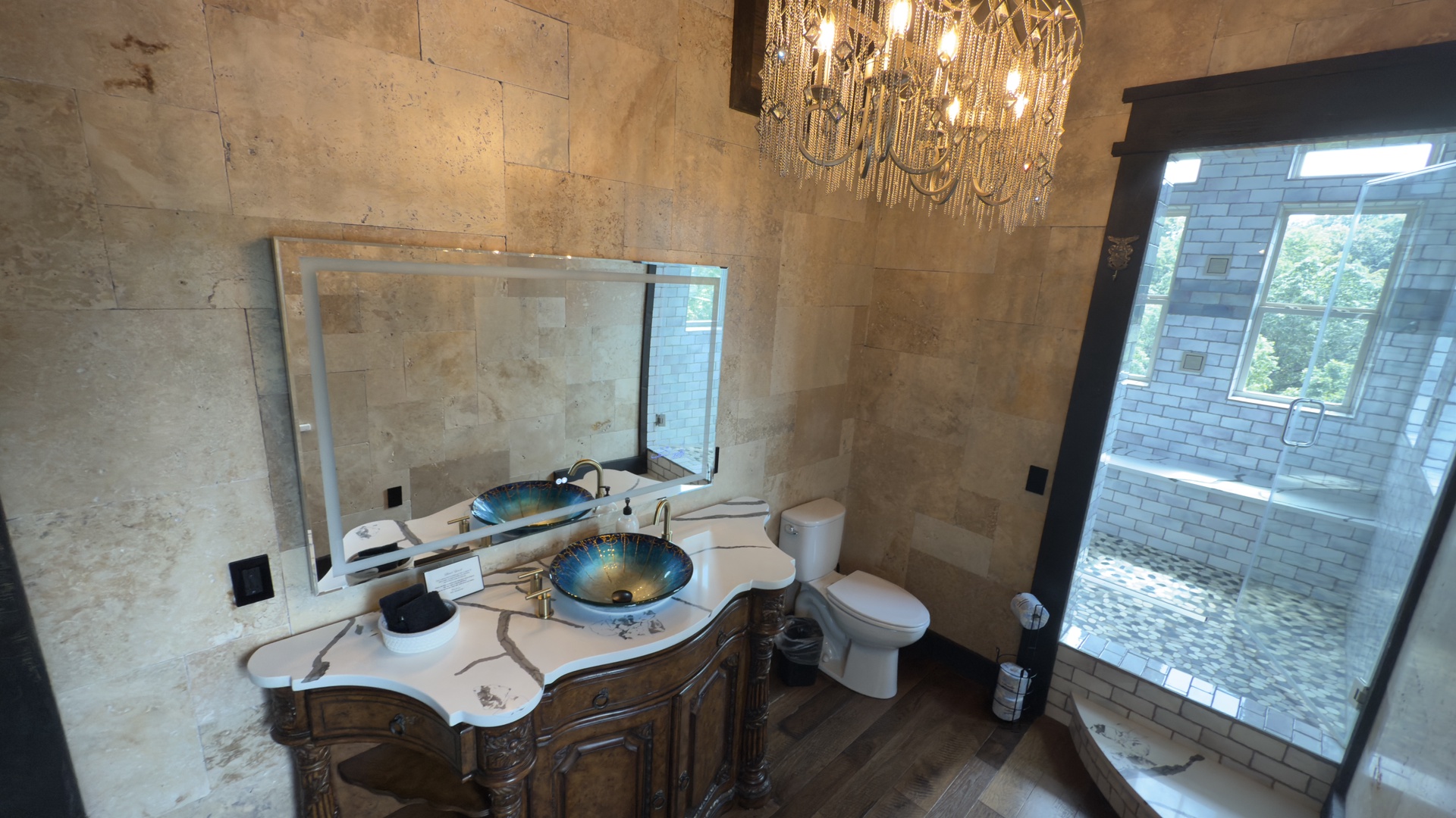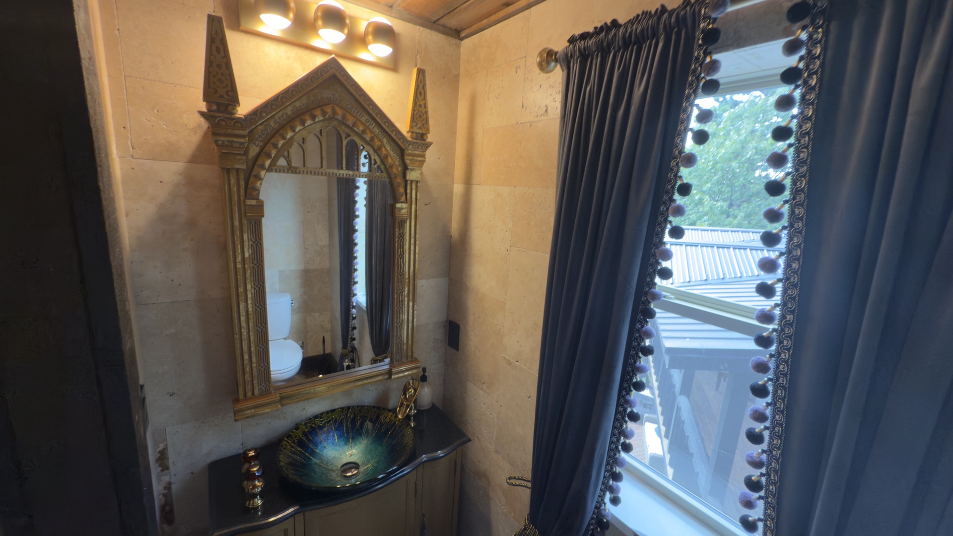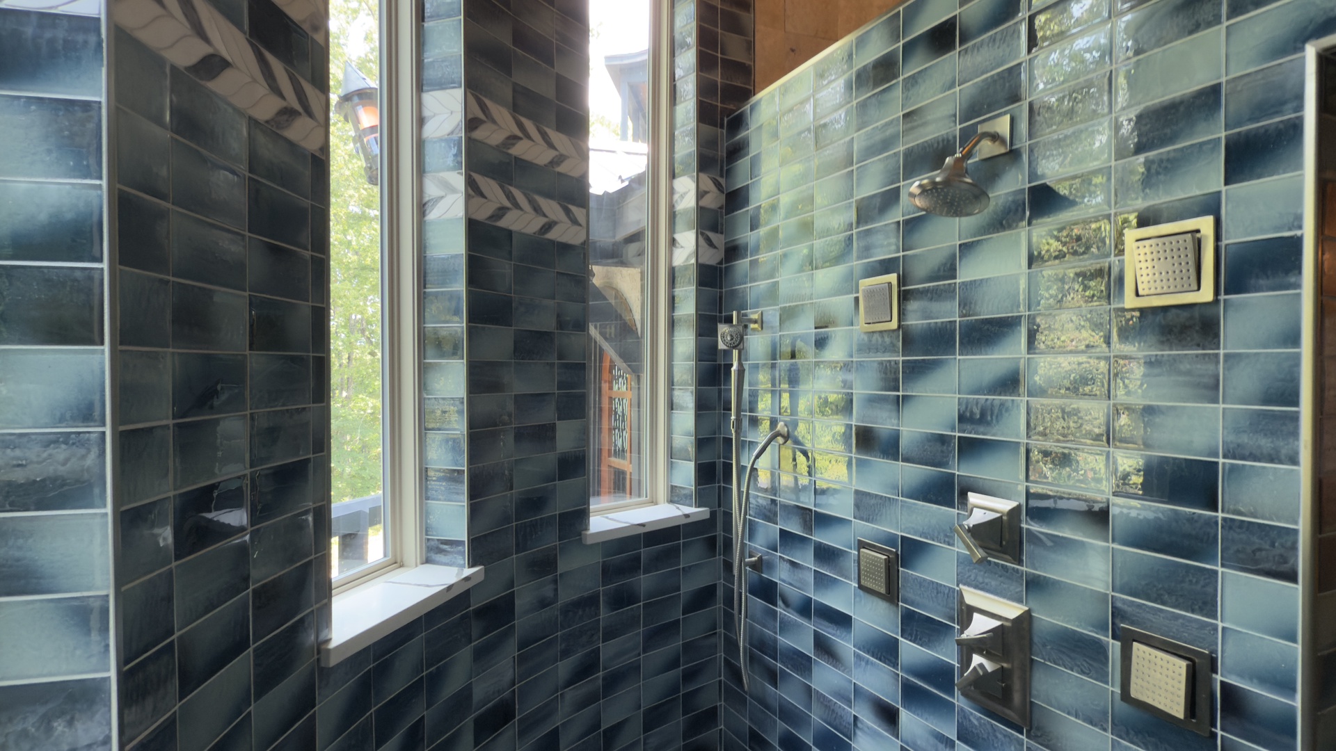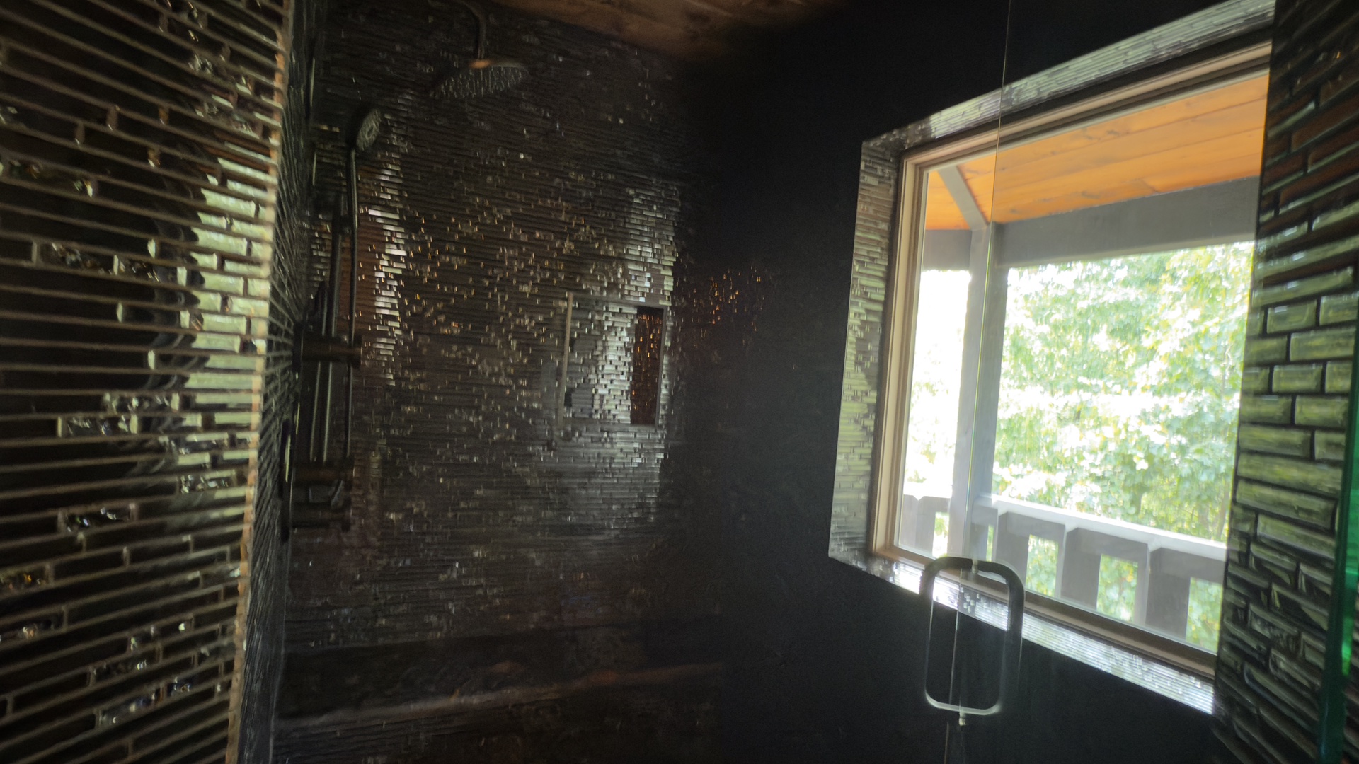Onward we travel up the stairs to the headmasters quarters. A phenomenal showering experience awaits in the room where the ghost girl moans. As if a troll smashed the plumbing, water sprays from 11 different orifaces and is accompanied by a steam generator for an in-home spa experience unlike any other. Enjoy the sunset from above the treeline as you shower in the tower with open windows for an outdoor bathing experience.