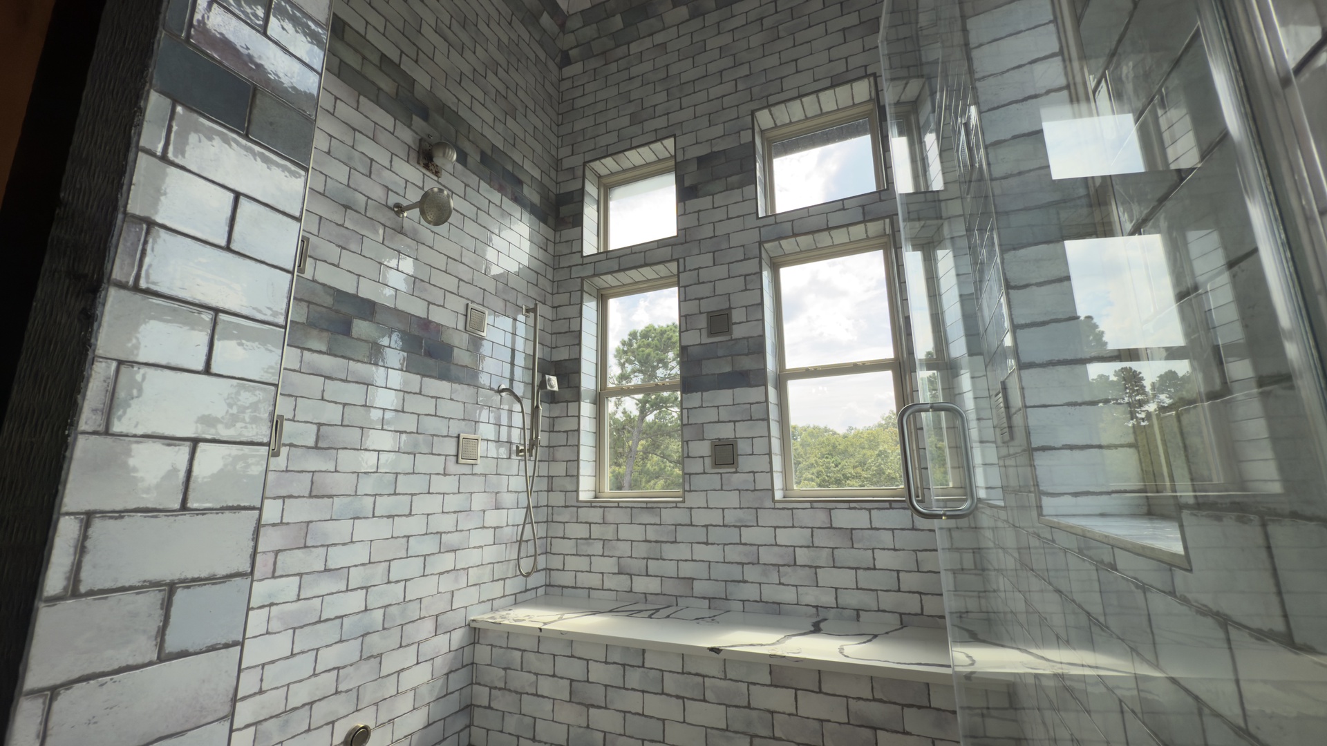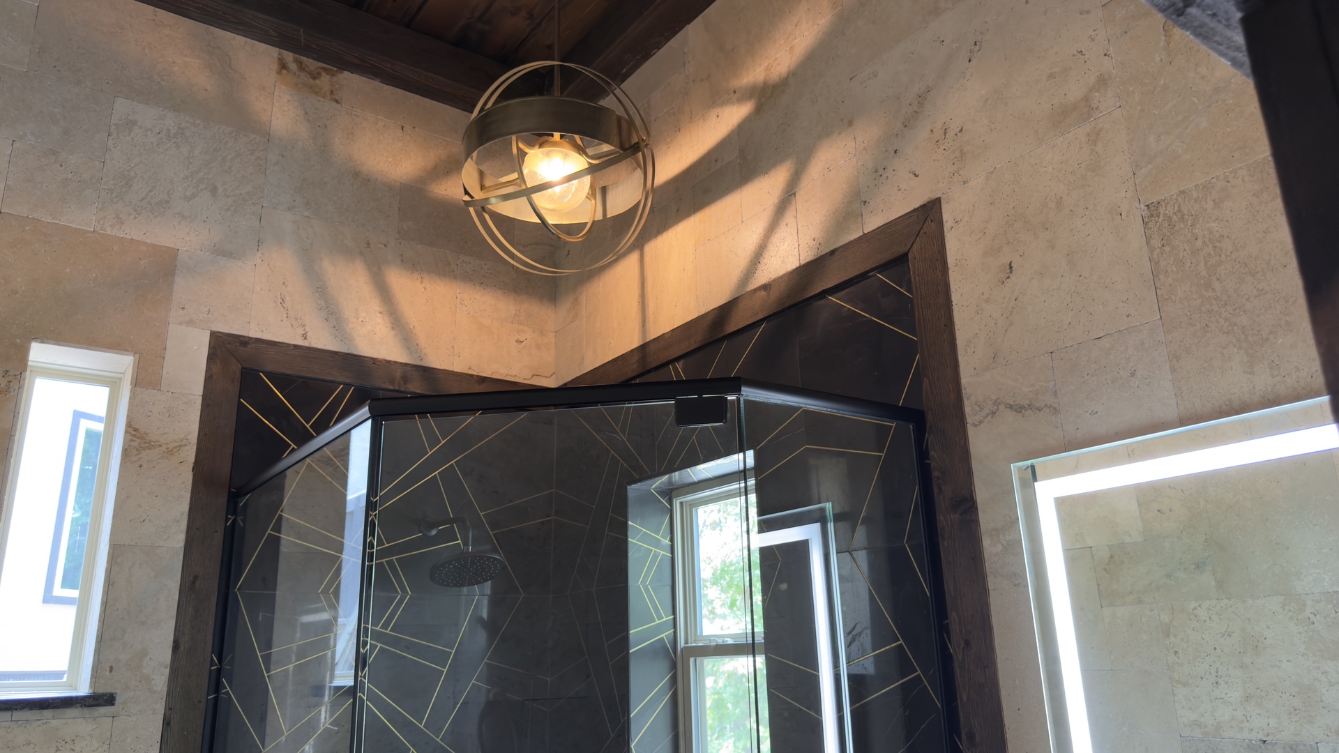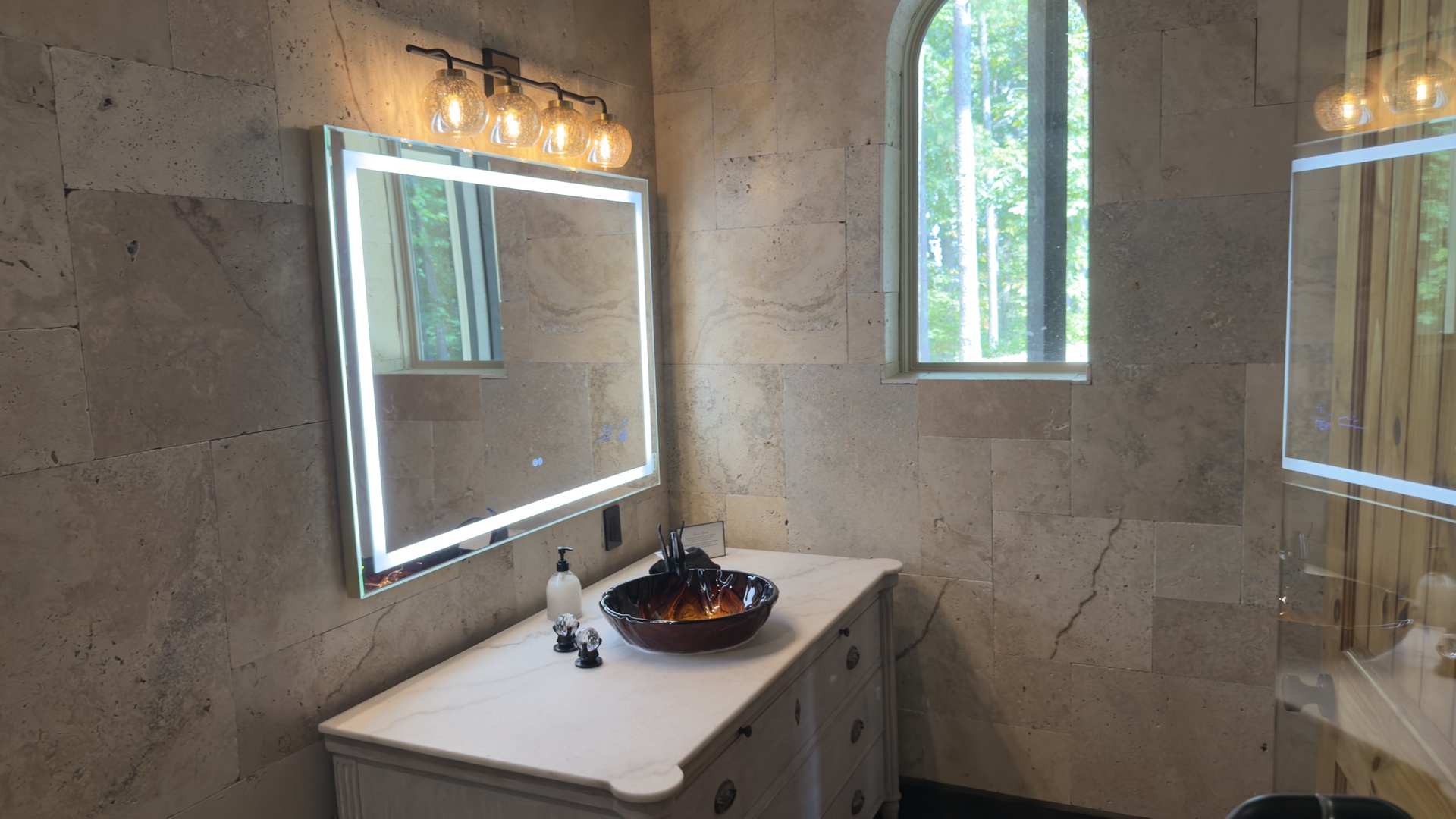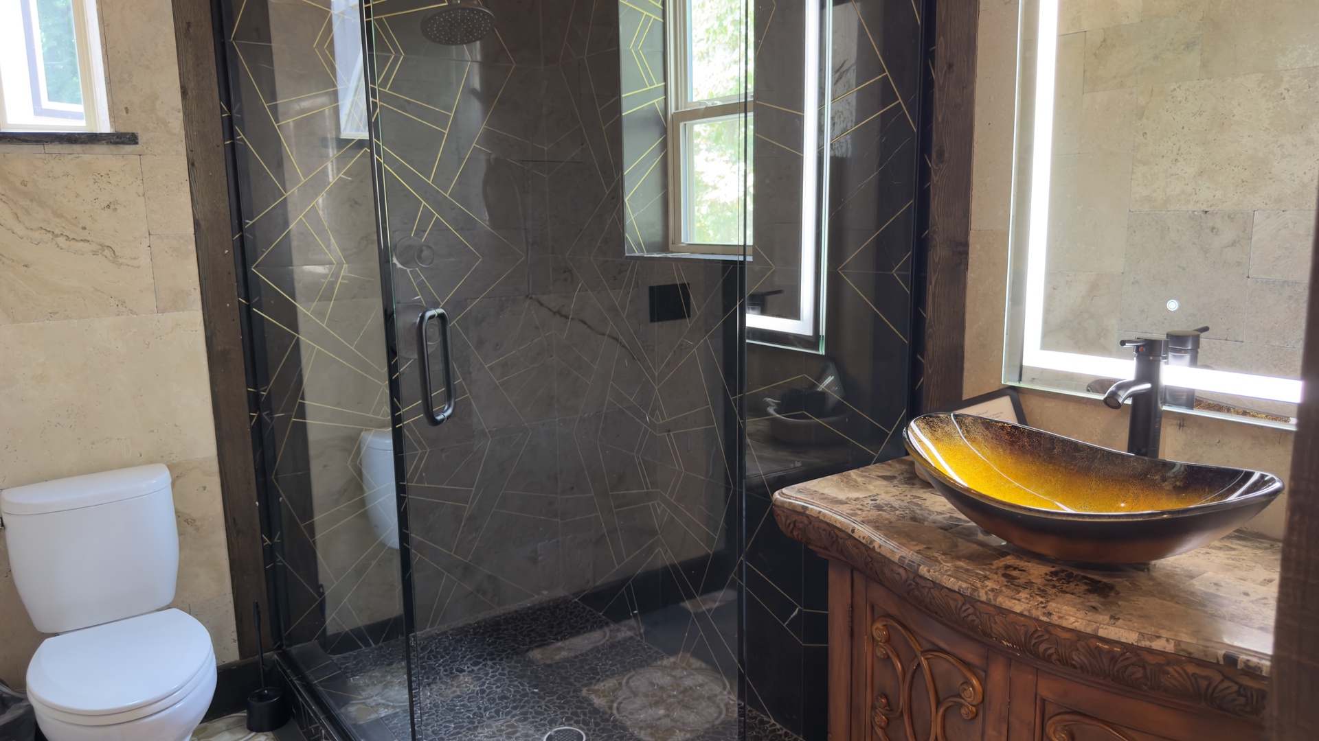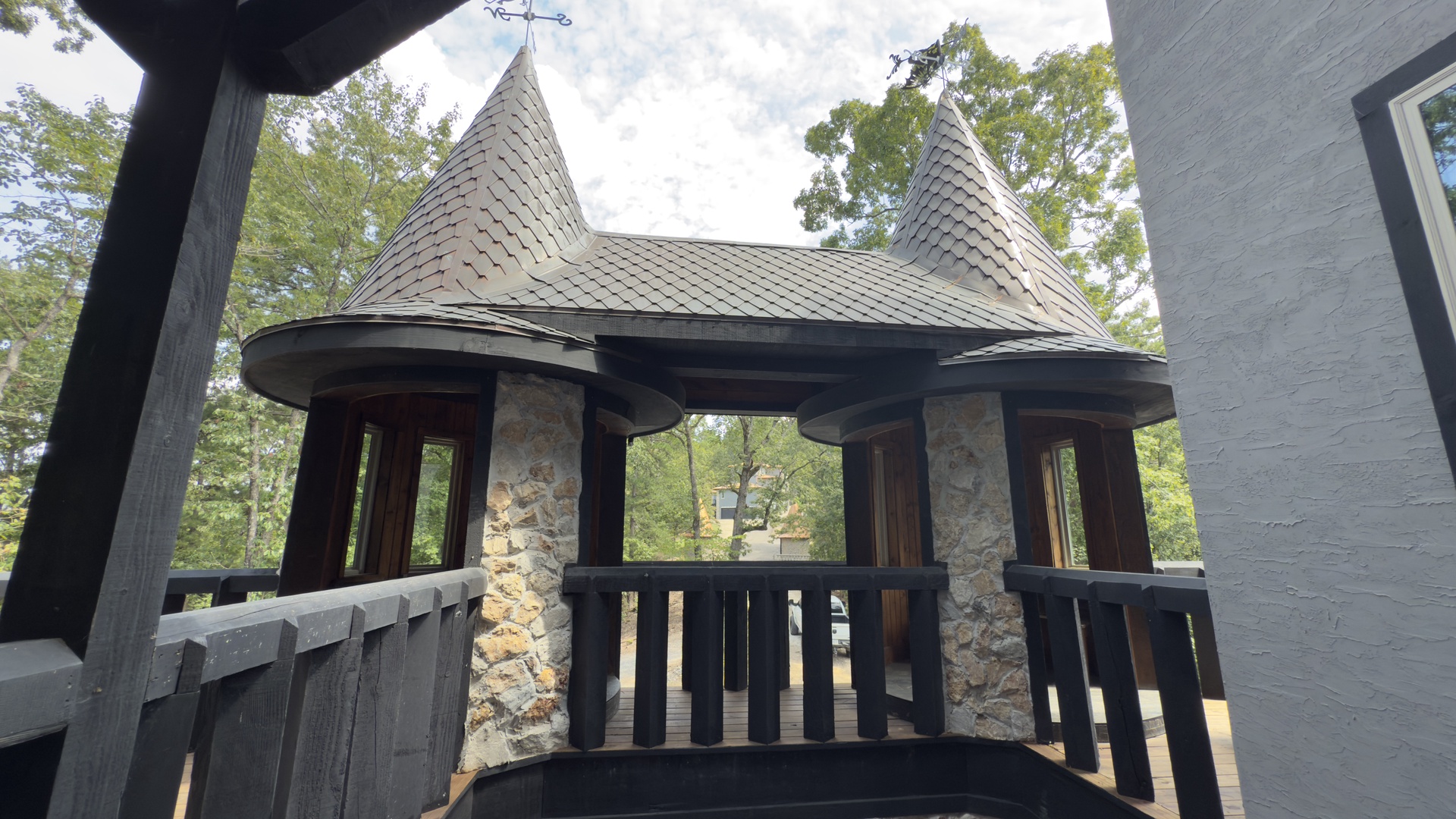 Onward we travel up the stairs to the headmasters quarters. A phenomenal showering experience awaits in the room where the ghost girl moans. As if a troll smashed the plumbing, water sprays from 11 different orifaces and is accompanied by a steam generator for an in-home spa experience unlike any other. Enjoy the sunset from above the treeline as you shower in the tower with open windows for an outdoor bathing experience.