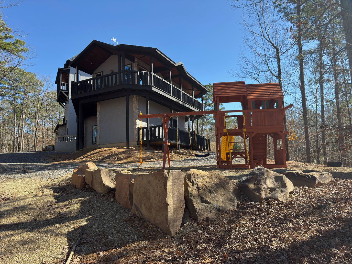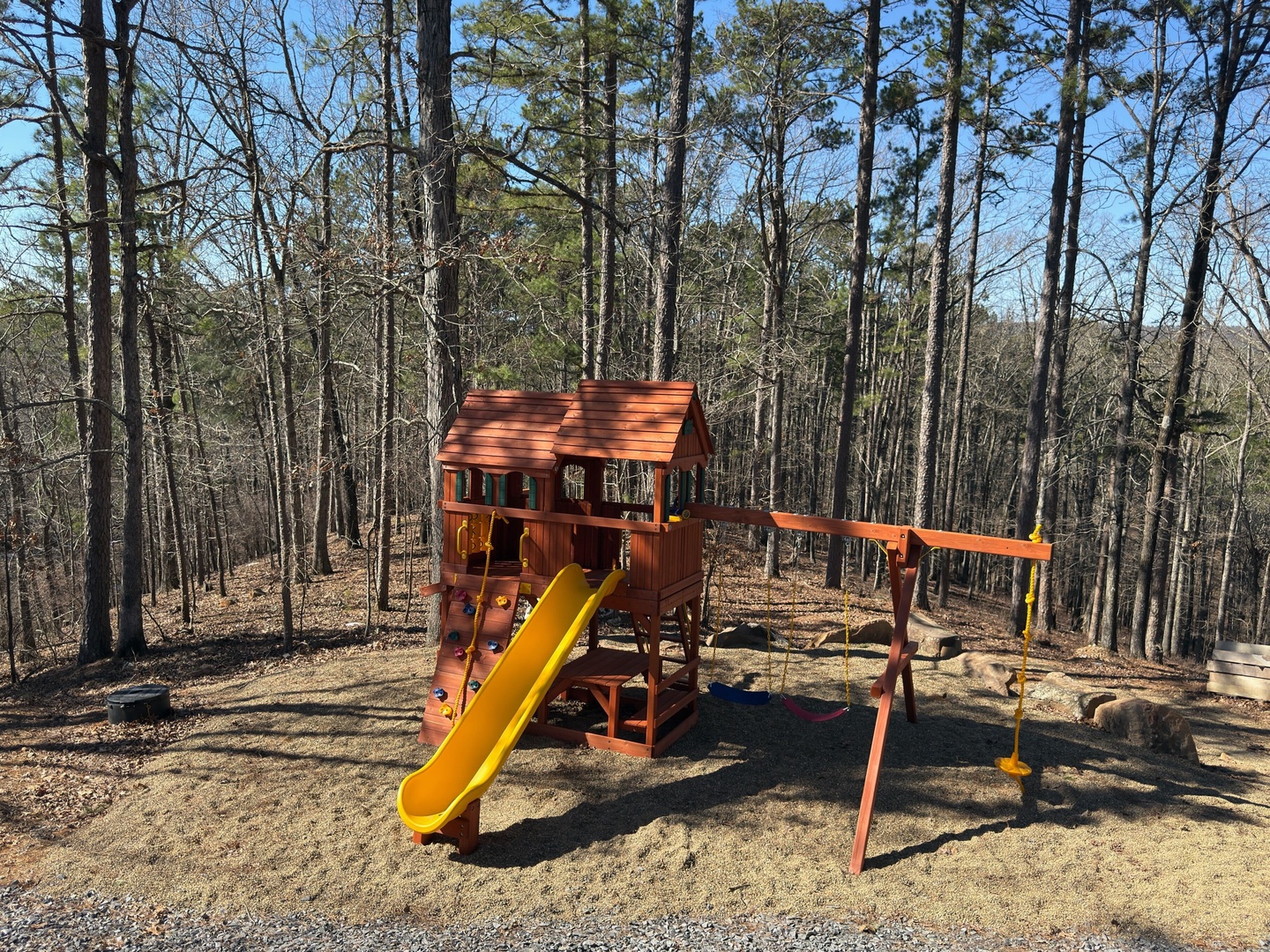 Just beyond the private rear deck, a wooded playscape offers a safe, imaginative space for younger guests—close enough for easy supervision while remaining visually discreet within the landscape.