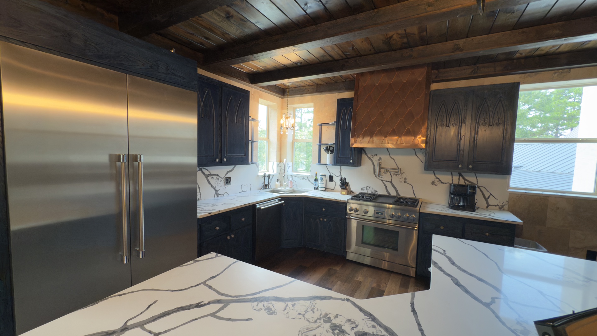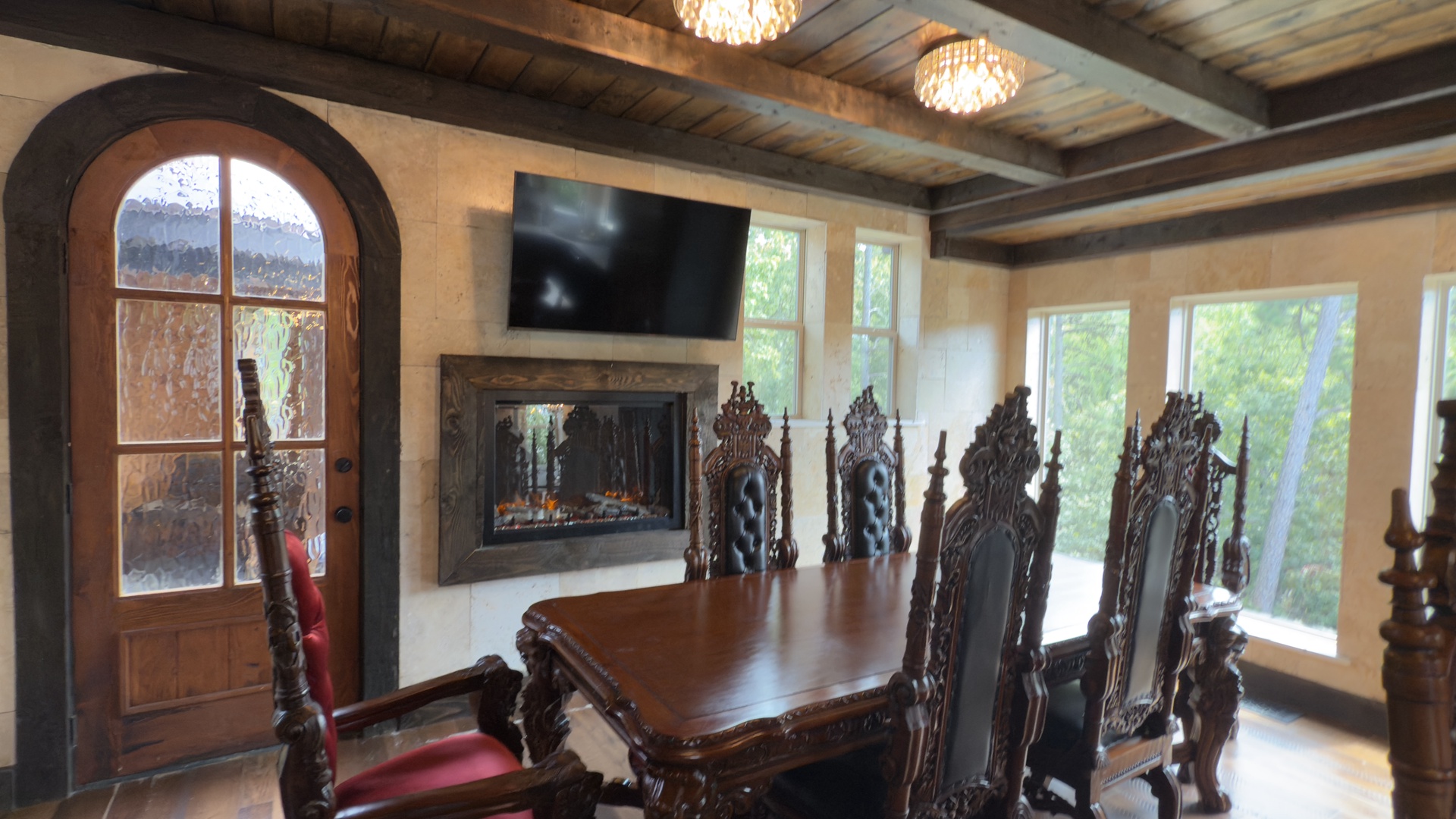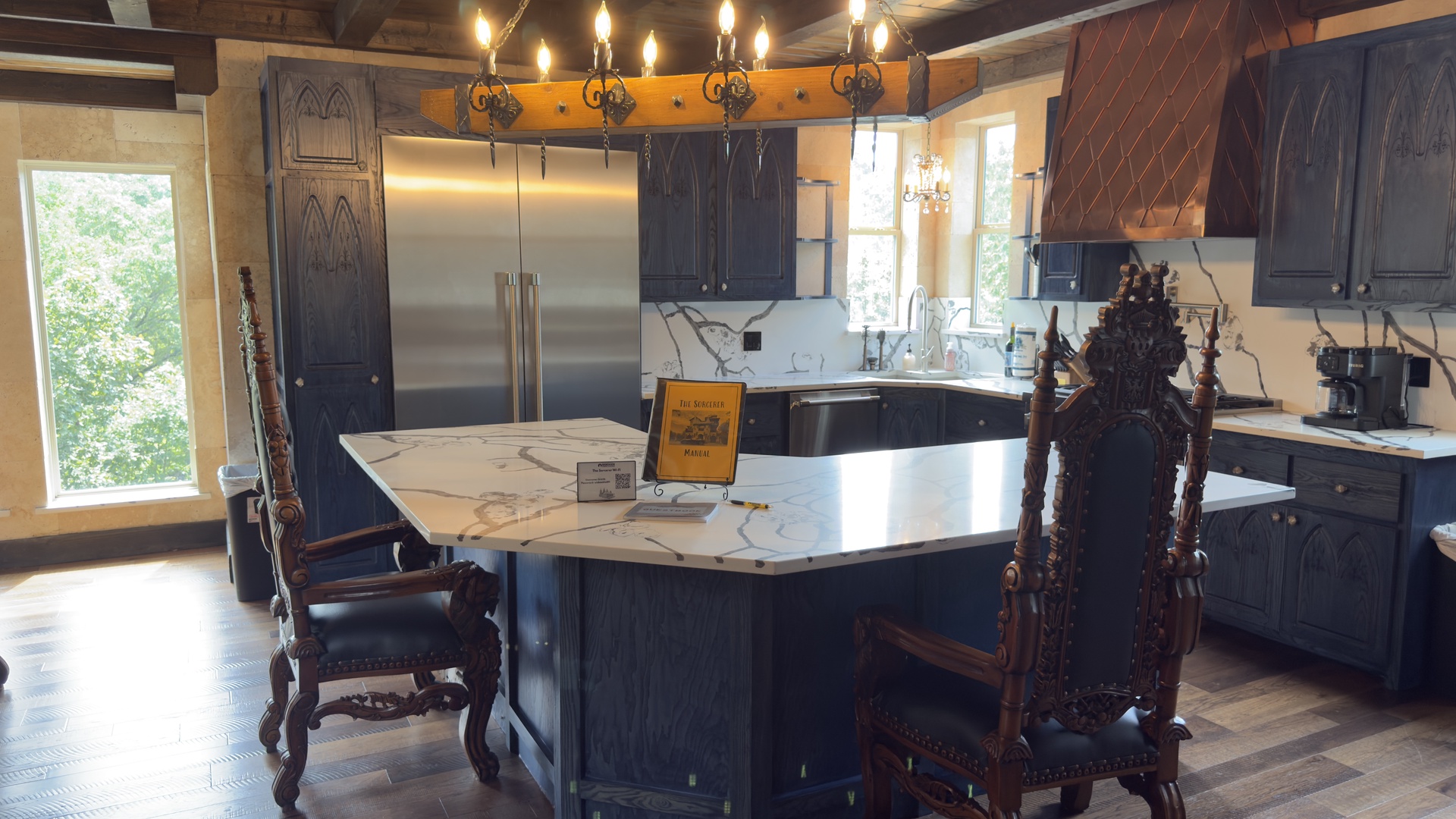 The primary kitchen and dining room can be accessed from either deck area. A royal dining table sits in front of a stunning electric fireplace and offers even more views into to surrounding forest. The kitchen is equipped with commercial Thermador appliances. A 24 inch refrigeration column and 24 inch freezer column guarantee more than enough room for the ingredients of the feasts. The 48 inch gas range has 4 burners and a built in griddle perfect for steaks or breakfast. Plenty of cabinetry, pantry and storage compliment the massive triangular island prep area. The half bath houses the mirror that shows the viewer's deepest desires. Illumination is a Requirement in the room and nods to the headmasters tool that retrieves balls of light.