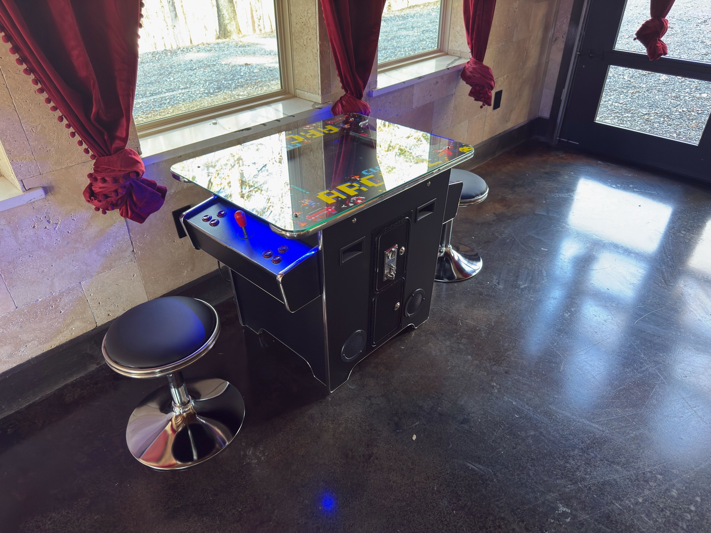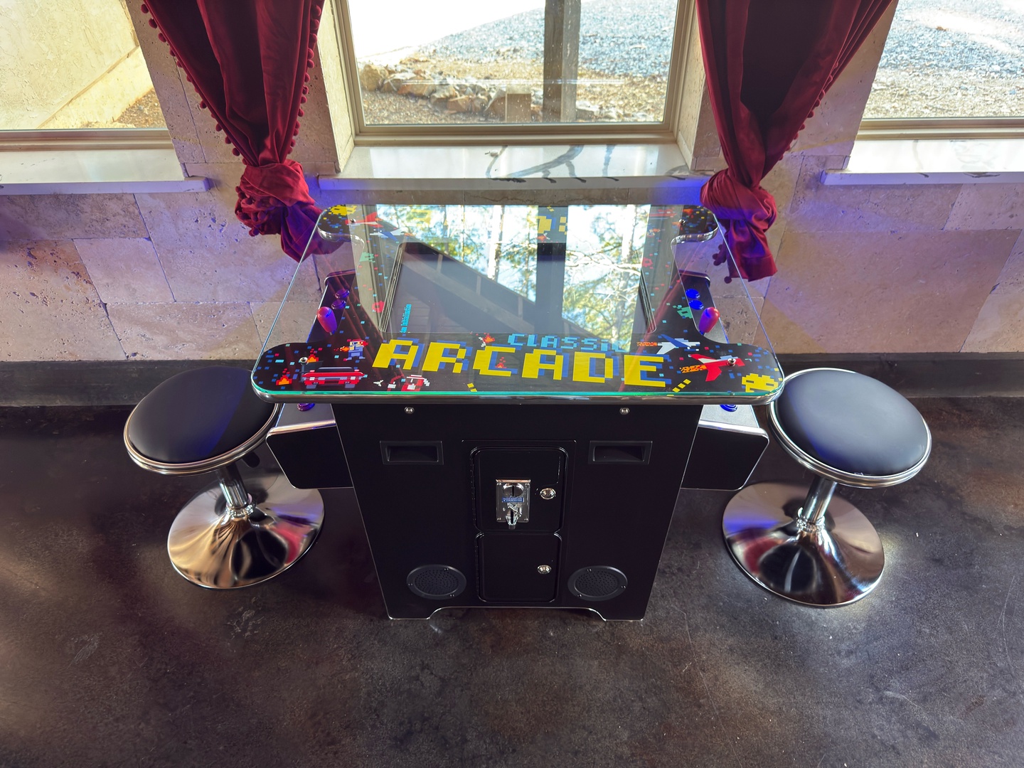 Across the courtyard, guests gather in a shared hall designed for leisure and conversation. A competition billiards table, shuffleboard, and full bar make this an inviting space for evenings spent together.