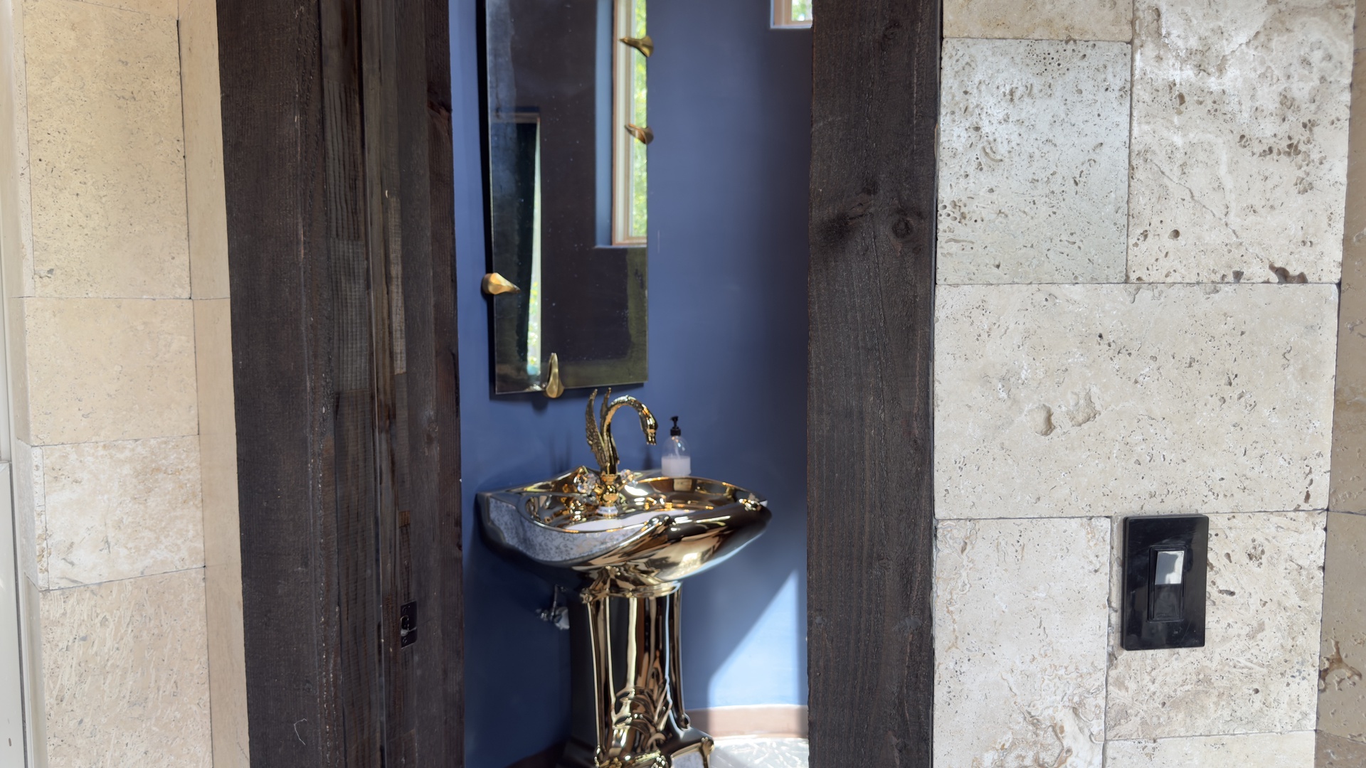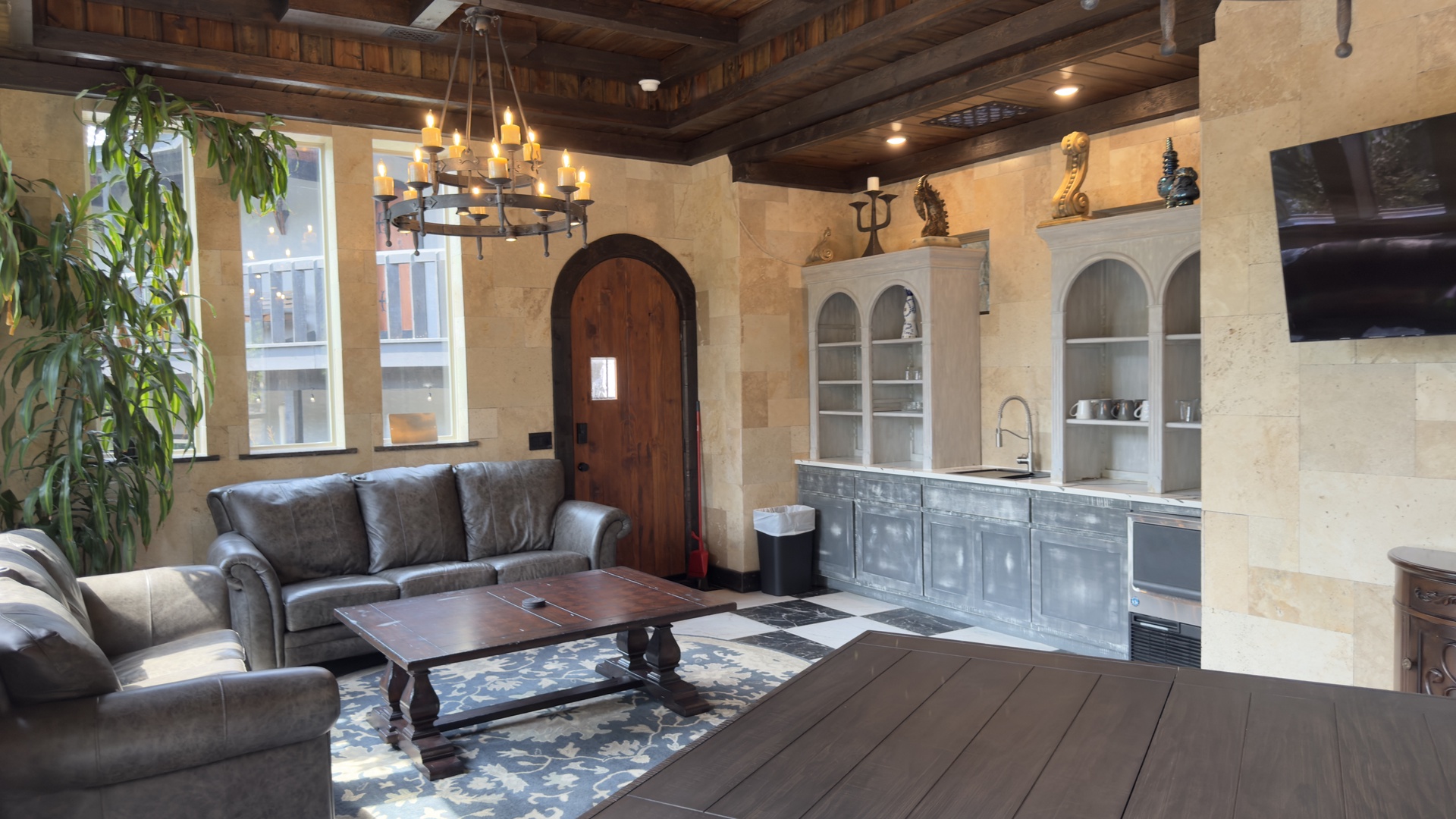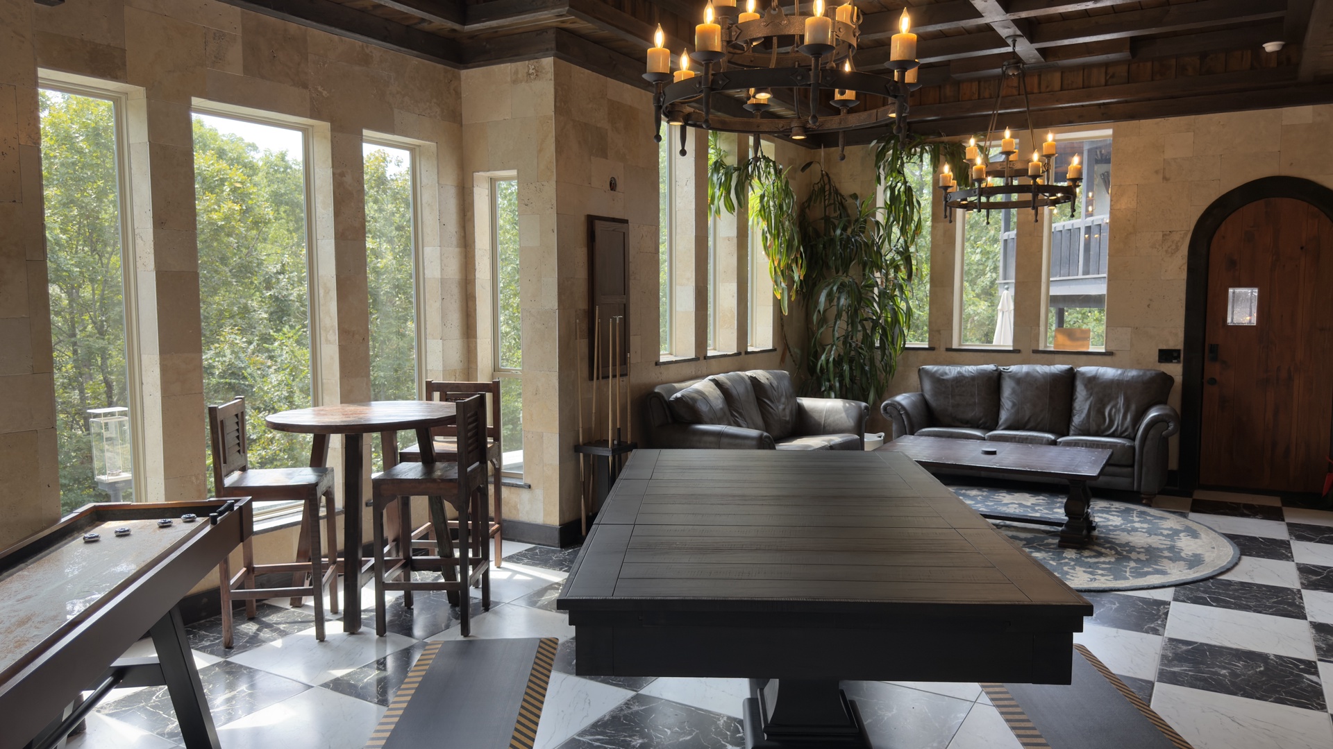 Across the courtyard is the Chess room. Featuring a competition billiard table, shuffleboard and fully functional bar, this is the perfect place for guests to hangout. The turret half bath pays homage to the room with winged keys. A large 20+ year old plant sprawls in the corner of the Chess room representing the constricting plant one can only avoid by relaxing.