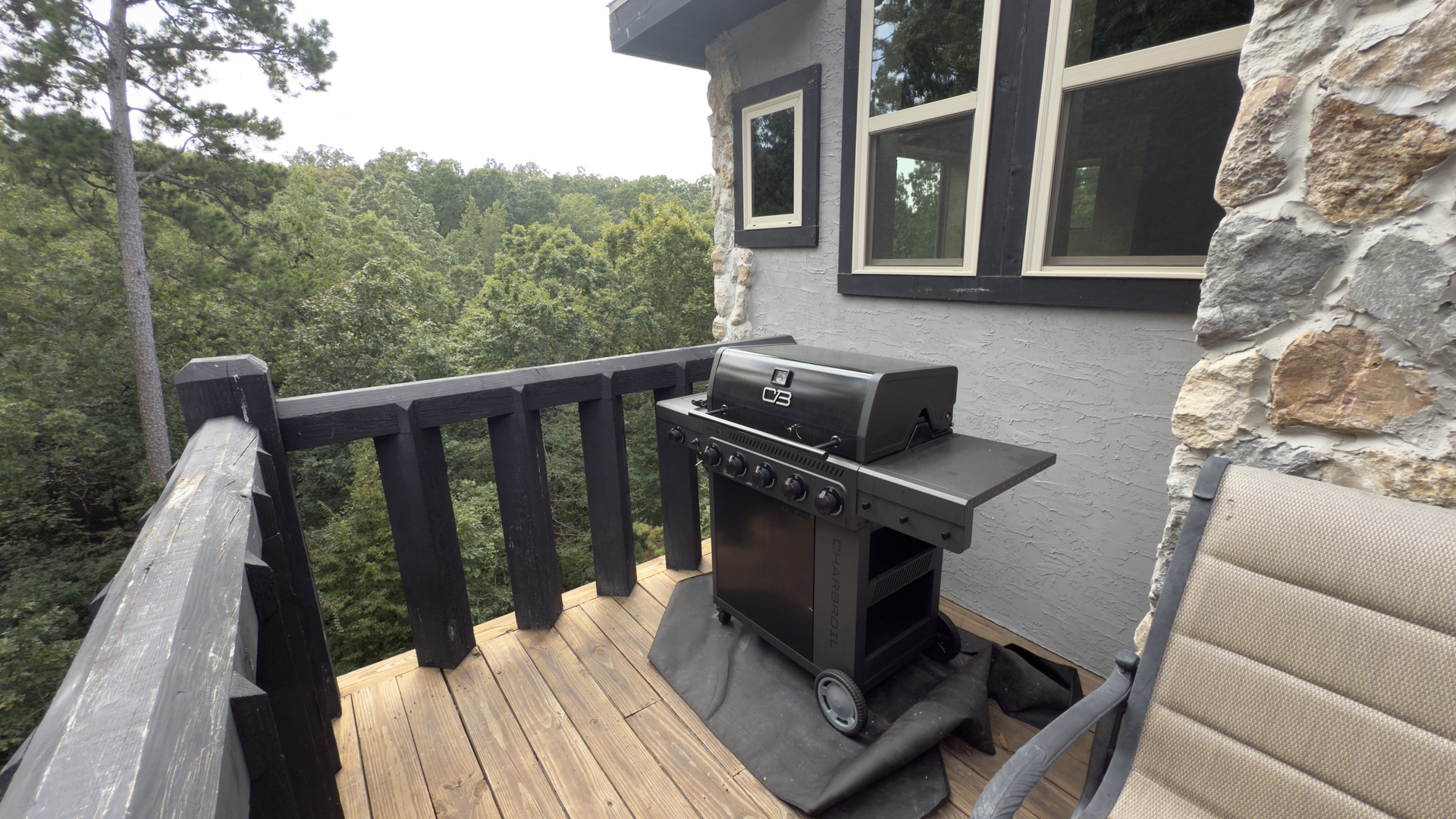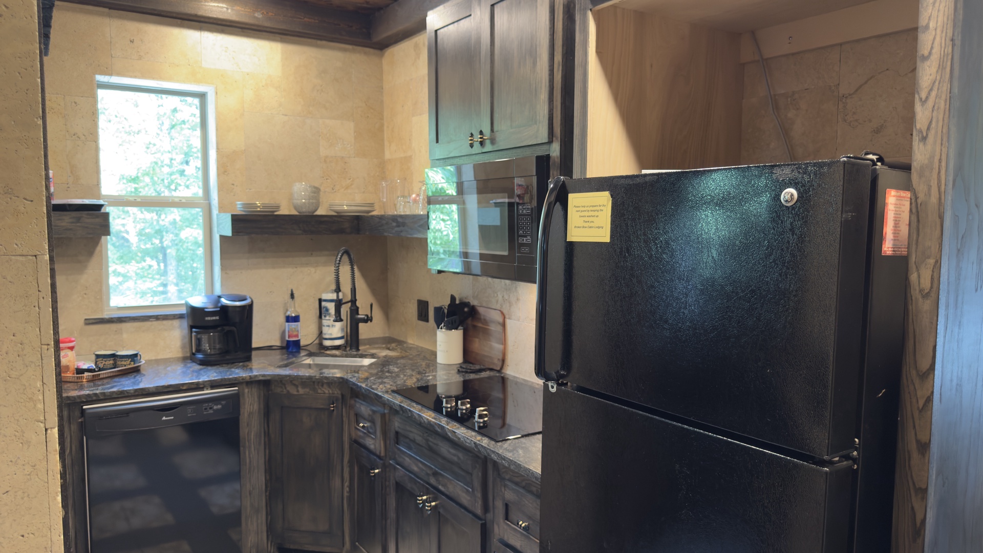 The Badger suite is earthy and cool with a turret reading nook and large windows with views of the forbidden forest. The mystical waters of Broken Bow Lake can also be seen in the distance beneath the canopy of the towering pines and oaks. The Badger has a private bath with custom shower and a galley kitchen with full size refrigerator, glass cooktop, microwave and dishwasher.
